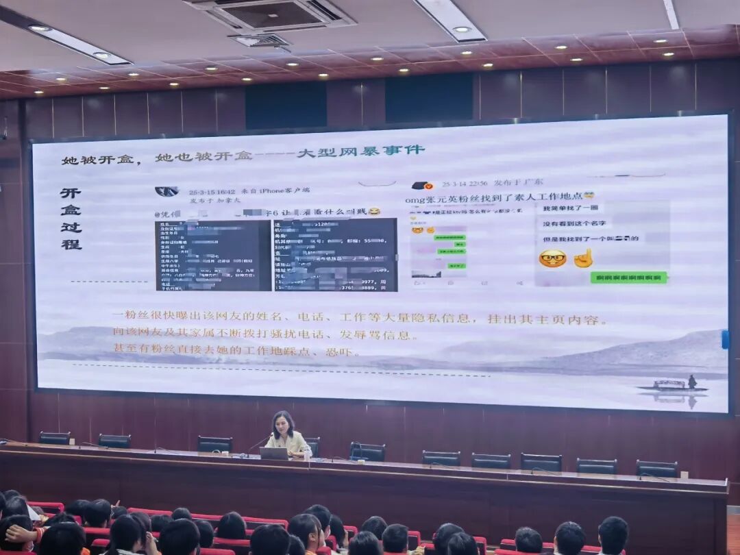 讲座第二部分聚焦隐私保护。王律师通过“开盒”事件的案例分析,揭示了网络暴力的严重后果。她指出,“开盒”行为不仅侵犯他人隐私权,还可能构成刑事犯罪。根据《民法典》《网络安全法》等法律规定,非法获取、泄露或公开他人隐私信息的行为将受到法律严惩。