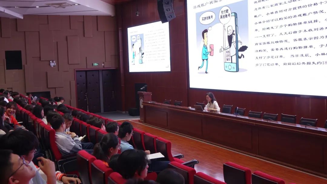 讲座伊始,王静律师通过多个贴近青少年生活的案例,揭示了电信诈骗和网络游戏消费陷阱的常见手段。例如,某中学生因扫描不明链接,被诈骗分子以“公安局办案”为由骗取17914元;另一案例中,未成年人因轻信低价游戏装备交易,最终损失惨重。王律师强调,诈骗分子常利用未成年人心智不成熟、法律意识薄弱的特点,诱使其成为网络犯罪的“工具人”。