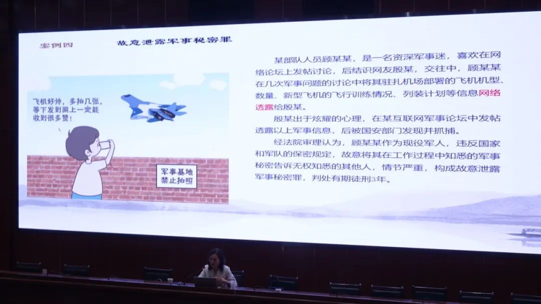 讲座最后,王律师强调了网络安全与国家安全的紧密联系。她通过多个案例警示同学们,网络并非法外之地,任何危害国家安全的行为都将受到法律严惩。例如,某无人机爱好者因非法拍摄军事部署并公开传播,被判处非法获取国家秘密罪。