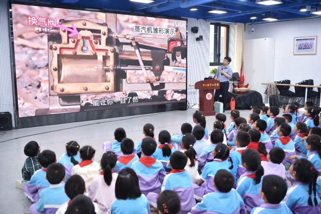 “蒸汽火车喷出的白烟里藏着什么秘密?”赵老师话音刚落,深具知识储备的男孩们已经抢答:“是瓦特爷爷的茶壶!”,第三排扎羊角辫的女孩辨识出四类发电机图片,准确说出了“这是核电发电、太阳能发电、水力发电和风力发电”的答案,引发全场掌声。
