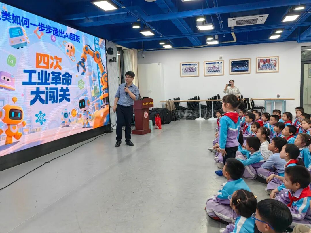 科技长河的奔涌,在童真的瞳孔里折射出彩虹般的光晕。在主讲人赵桐老师的带领下,同学们通过四次工业革命大闯关(第一关:蒸汽的力量、第二关:电的秘密、第三关:电脑诞生记、第四关:AI进化记),开始探索人类如何一步步制造出AI朋友。