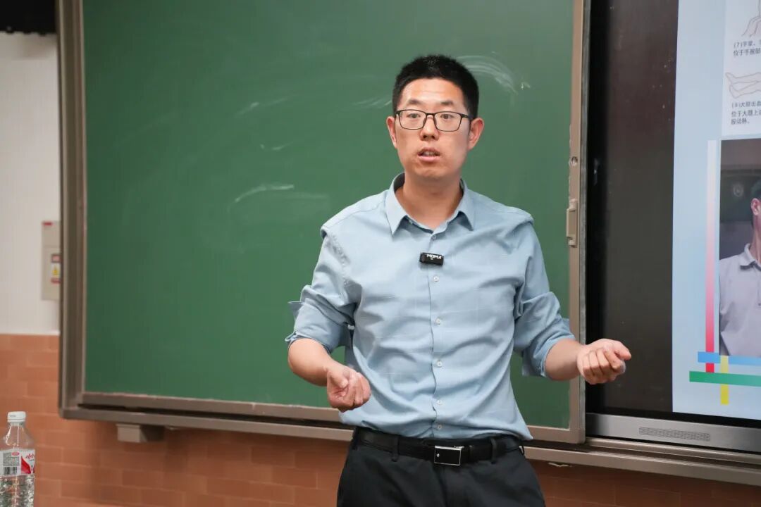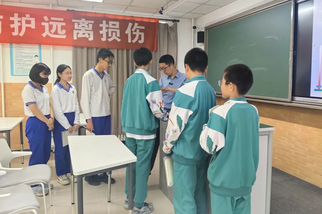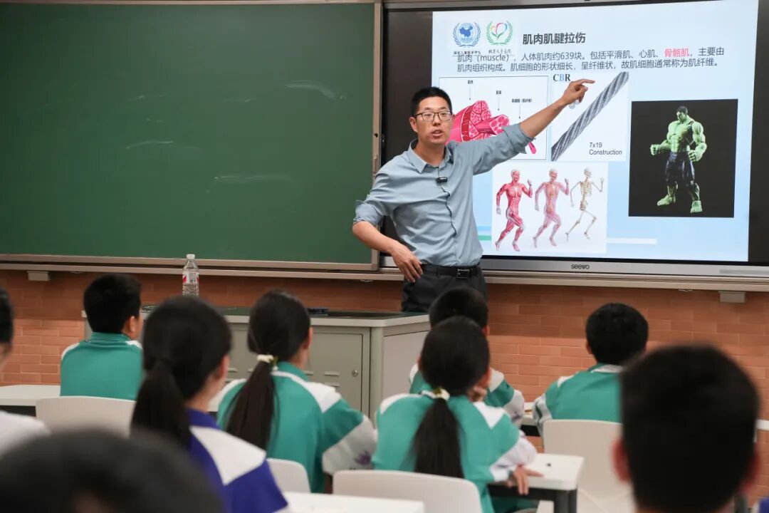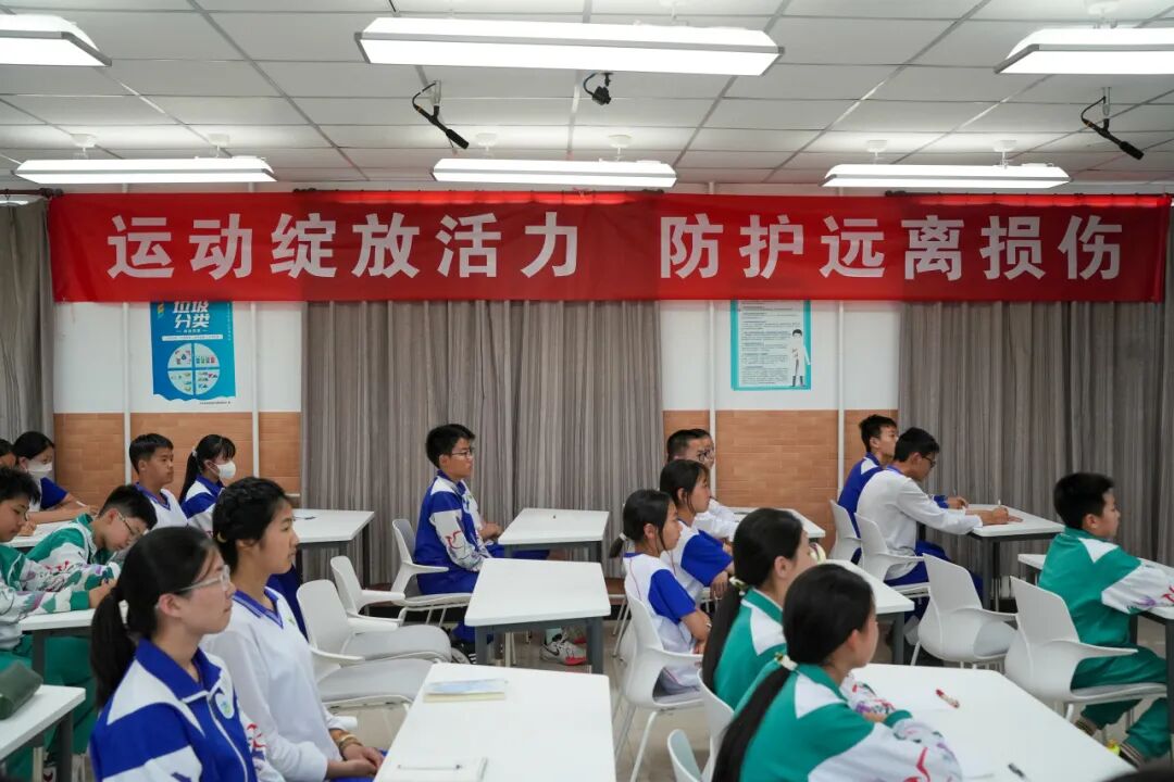 课堂上,朱医生的讲解仿佛自带“特效”,把抽象的文字变成一幅幅生动的画面,让同学们沉浸其中,不知不觉中就了解了骨骼、肌肉以及韧带的关系。青少年处于生长发育期,骨骼、肌肉等尚未成熟,运动损伤风险较高:生长板脆弱,过度运动易损伤;肌肉发育滞后于骨骼,协调性差,易因动作失衡而受伤;热身不足、过度训练或装备不合适也是运动损伤的常见诱因。运动中,直接撞击或关节过度扭转,可能引发急性损伤,如踝关节扭伤、手指骨折,出现疼痛、肿胀。若急性损伤未妥善处理,则会转为慢性损伤,像习惯性崴脚、网球肘等问题。