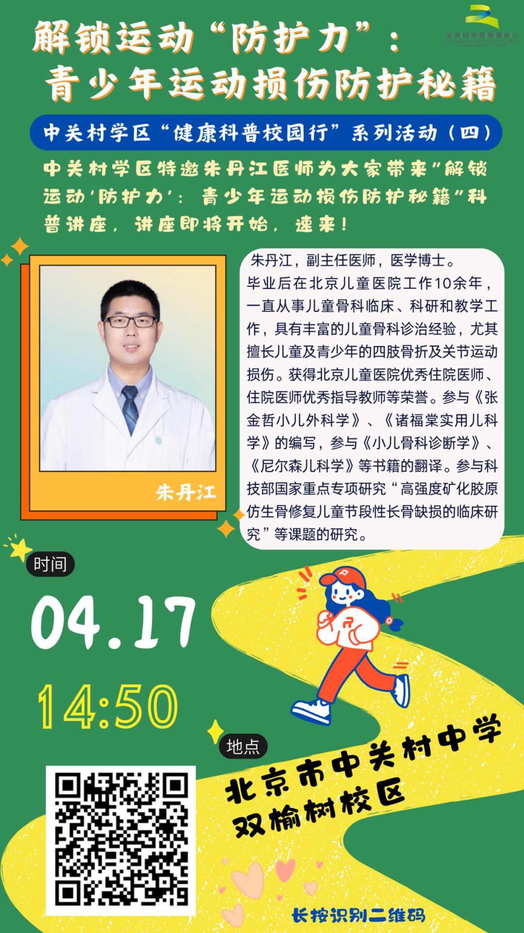 2025年4月17日,中关村学区“健康科普校园行”第四期活动在中关村中学成功举办。本期聚焦青少年运动安全主题,特邀北京儿童医院骨科专家朱丹江副主任,以《解锁运动“防护力”——青少年运动损伤防护秘籍》为题展开深度讲解。活动通过剖析运动损伤成因、类型及科学防护策略,为青少年运动安全构建专业防护网。中关村中学双榆树及清华园校区1200余名师生通过线上线下联动参与学习。