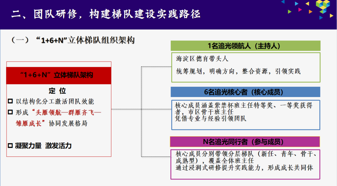 “追光”班主任工作坊以“铸魂、赋能、成长、落地”为主线,构建起独具特色的专业发展体系。工作坊将“为党育人”的使命融入班级管理,以“追理想之光、专业之光、生命之光、协同之光”为精神内核,通过“1+6+N”立体梯队架构(1名领航人统筹全局、6名核心成员示范引领、N名同行者分层进阶),实施“春晖”“芬芳”“绽放”“金穗”四大培养计划,精准匹配不同发展阶段需求。同时,自主研发的“追光课程资源包”涵盖基础能力、进阶发展、实践案例三大模块,为班主任提供可持续的学习资源支撑,助力其实现从新手到专家的跨越。