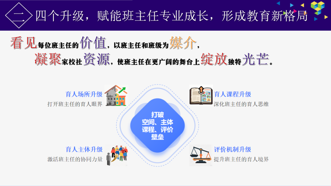 面对时代要求,周凯处长指出,班主任要紧扣“立德树人”根本任务。一方面,挖掘校园活动资源,引导学生树立规则意识;另一方面,用班会塑造班级文化,以家长会构建家校共育格局。