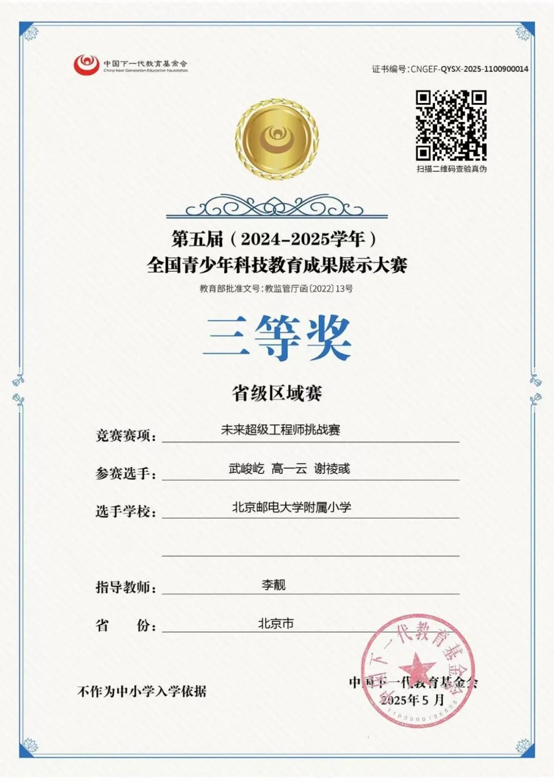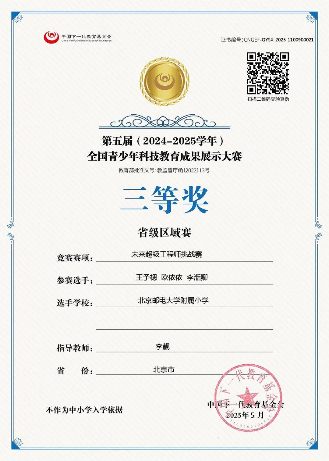 在充满创新与挑战的科技舞台上,一群小小少年以智慧为帆,以勇气为桨,乘风破浪!北京邮电大学附属小学6 组学生在第五届(2024-2025学年)全国青少年科技教育成果展示大赛中 “未来超级工程师挑战赛” 中大放异彩,用实力书写了属于他们的科技传奇!