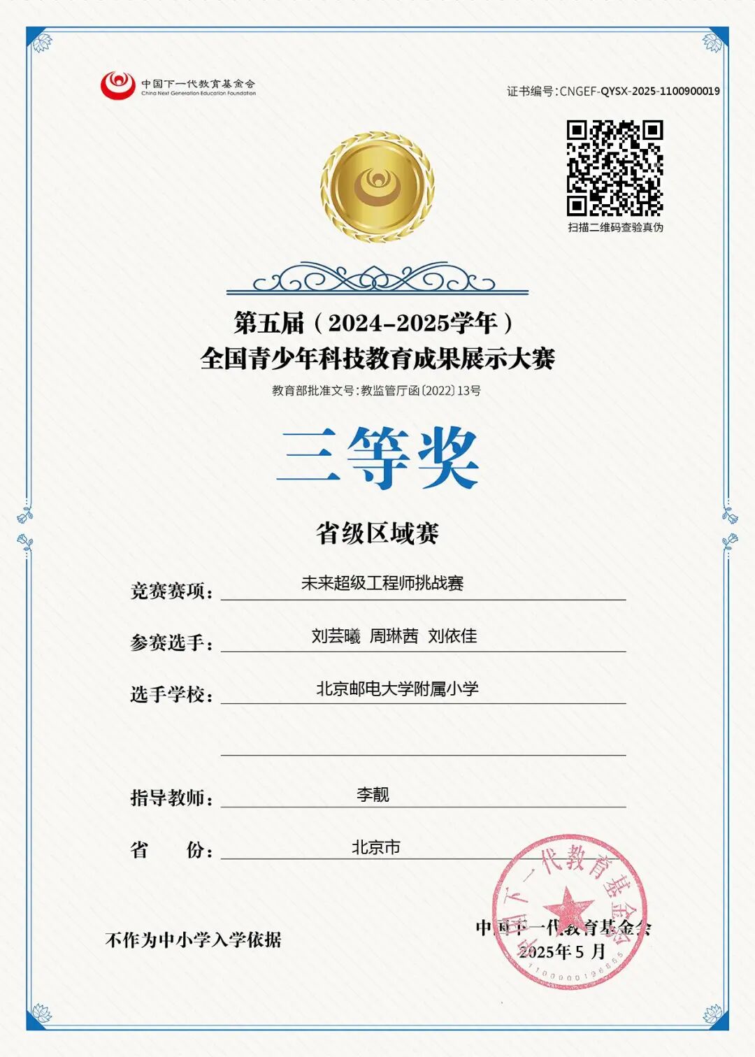 此次比赛,不仅让同学们收获了荣誉,更培养了他们的科学素养与团队精神。他们在实践中感受科技的魅力,在挑战中突破自我,在合作中共同成长。相信这些经历,会成为他们成长道路上宝贵的财富,激励着他们在未来的科技探索之路上继续前行!也希望更多的同学能加入到科技探索的队伍中来,让创新的种子在北邮附小的校园里生根发芽,绽放出更加绚烂的科技之花!