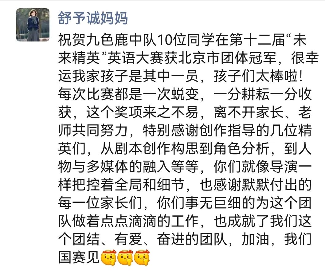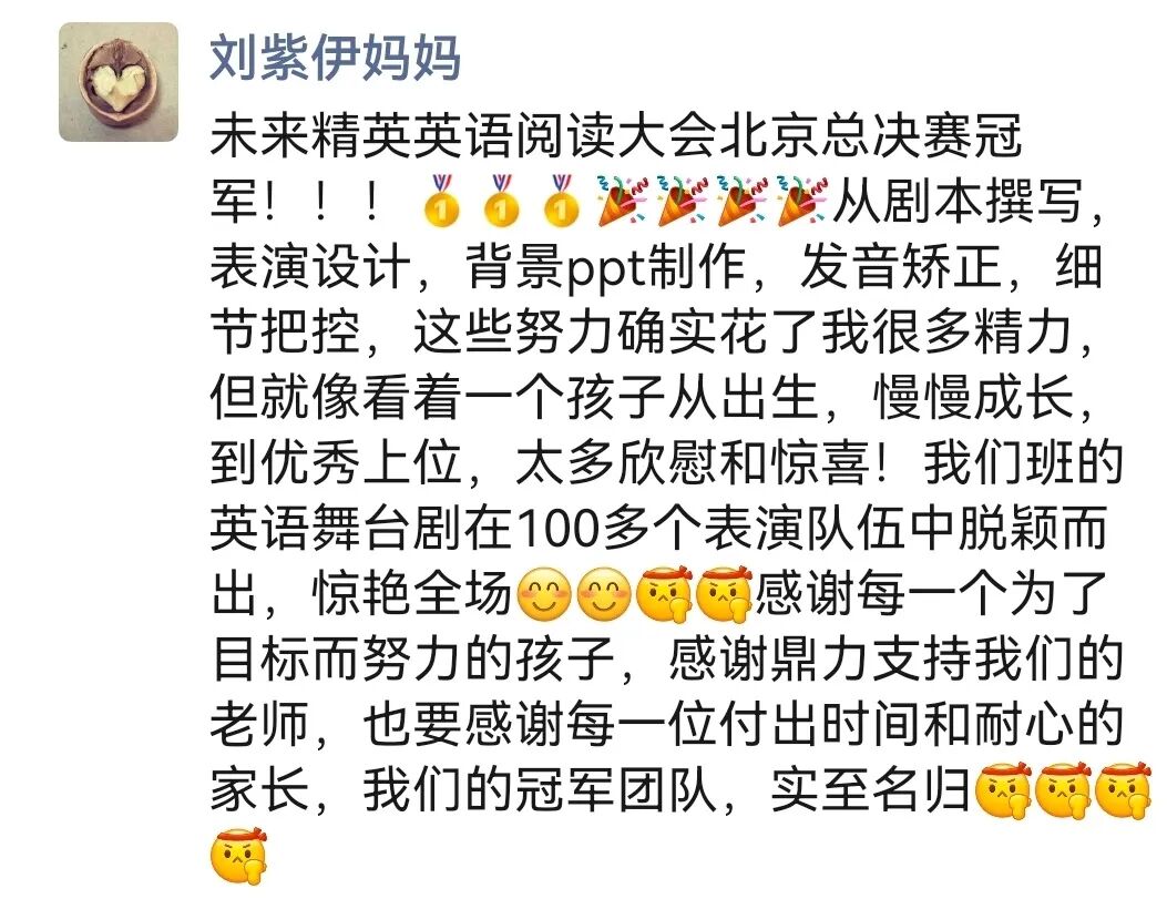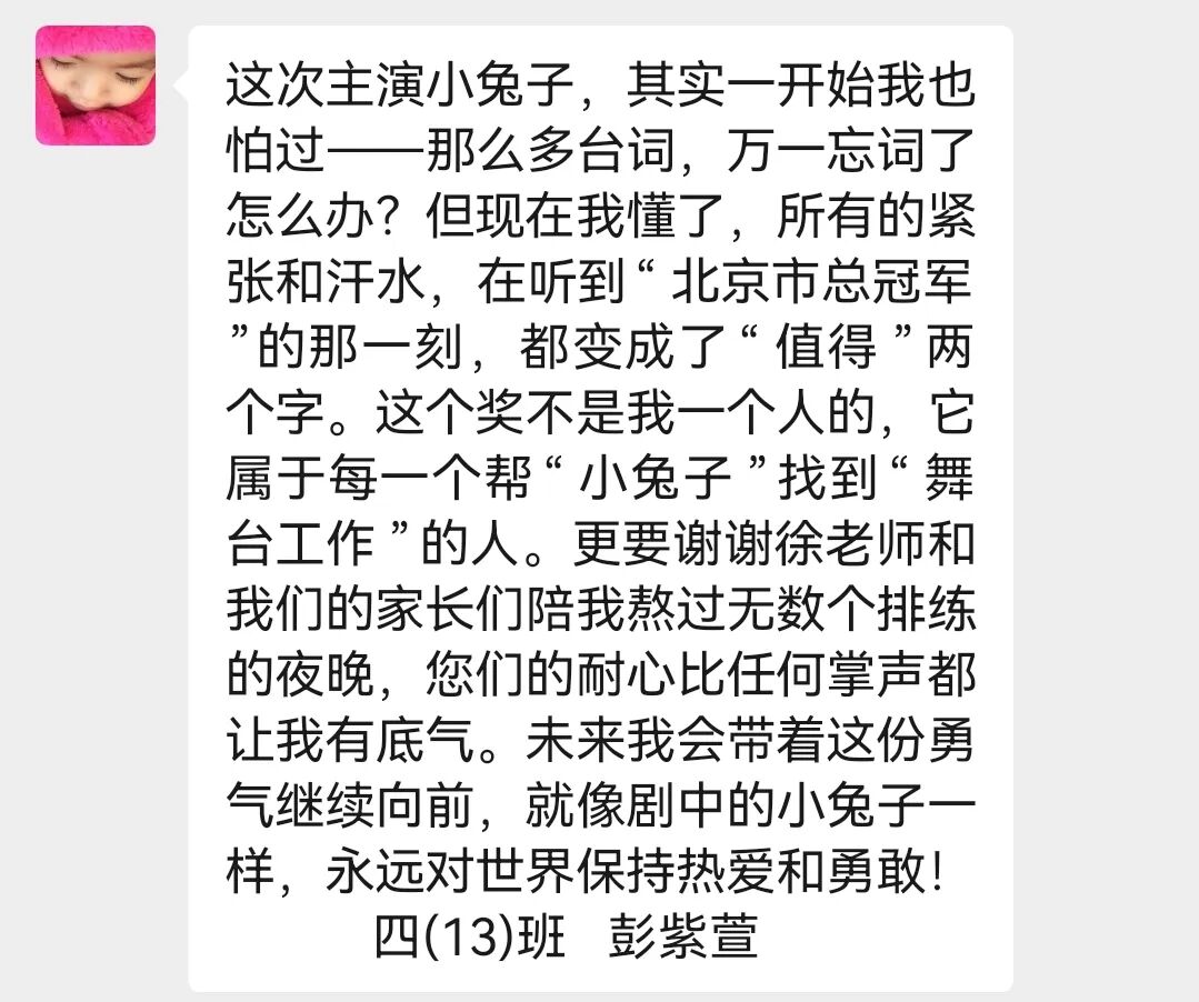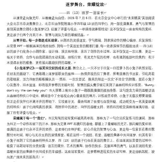 四13班携原创英语舞台剧《小兔逐梦记》,亮相“未来精英”英语阅读大会北京市总决赛并一举夺冠。孩子们全程参与创作,从剧本打磨到表演编排都倾注了心血,将小兔逐梦的挫折与蜕变生动展现,征服了全场,这部剧见证了他们的成长与蜕变。