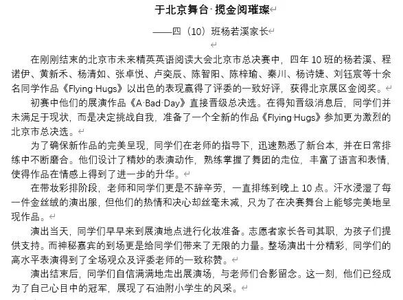 当三座奖杯在聚光灯下交相辉映,北京石油学院附属小学的英语戏剧教育已然绘就一幅生动的成长图景。感谢学校为石油附小少年搭建的戏剧梦想舞台,感恩老师、家长们风雨无阻的守护。英语与戏剧融合,传统与现代碰撞,孩子们以文化自信走向世界。这便是教育之美,让孩子们追随光,成为光,散发光,让戏剧的暖阳洒满孩子的成长道路,照亮每一个孩子用表演传递爱与文化的逐梦之旅!