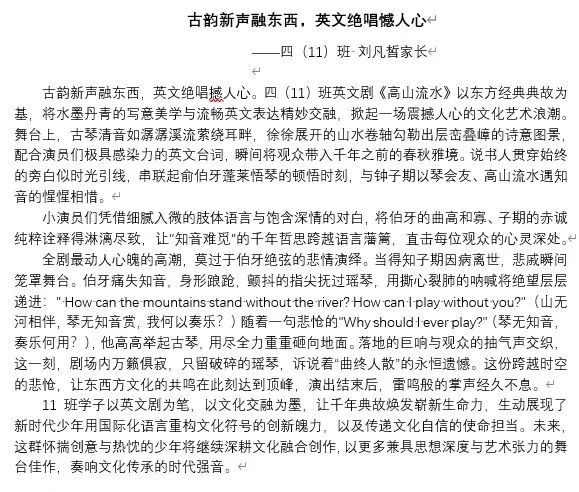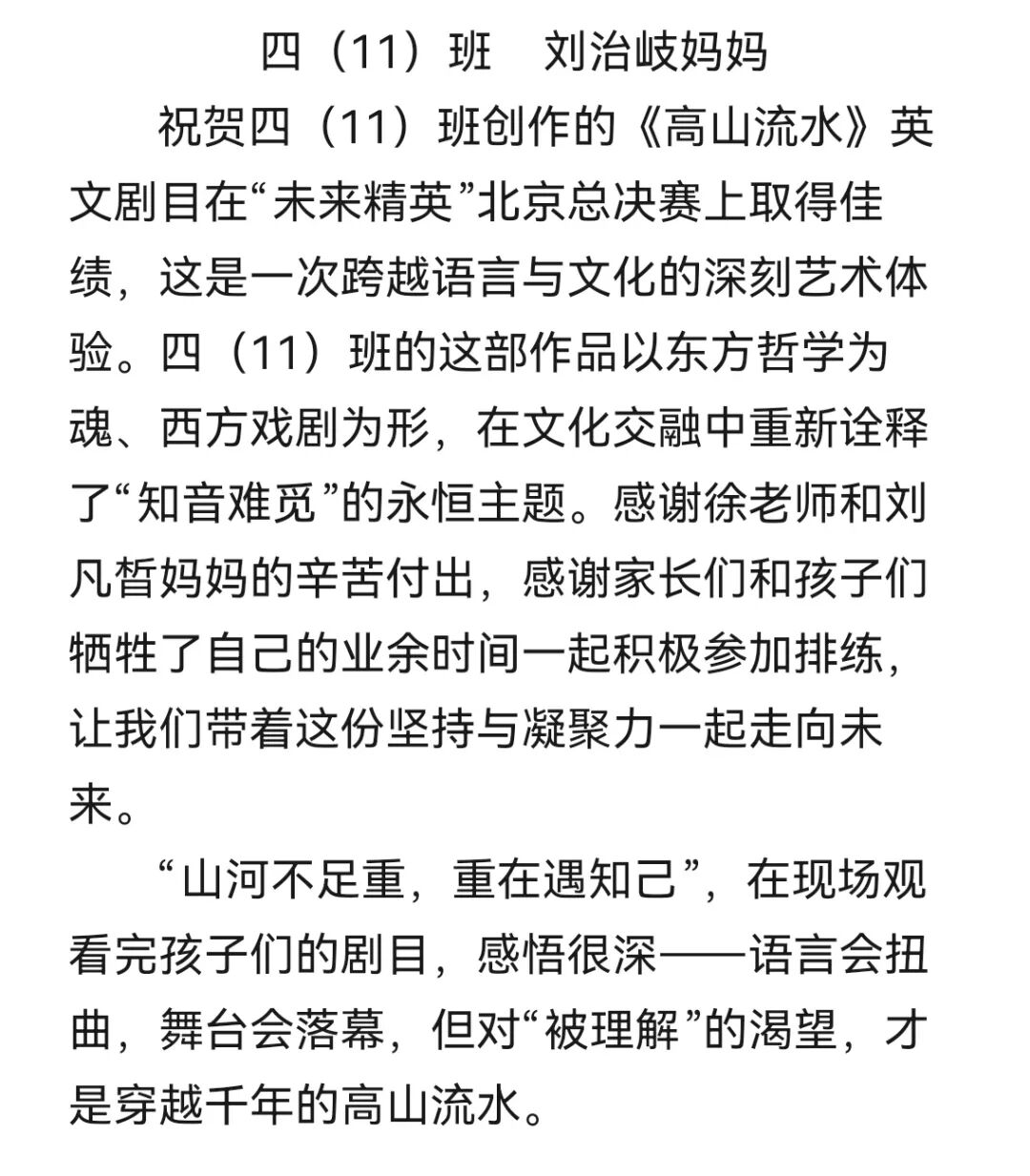 古韵新声交融,四11班英语剧《高山流水》在“未来精英”市赛获团体季军。该剧以东方典故为基,将水墨美学与英文表达精妙结合。小演员们用细腻肢体与深情对白,完美诠释了“知音难觅”,伯牙绝弦的高潮演绎更是震撼,引发东西方文化共鸣。11班学生以创新展现文化自信,未来将继续奏响文化传承强音。