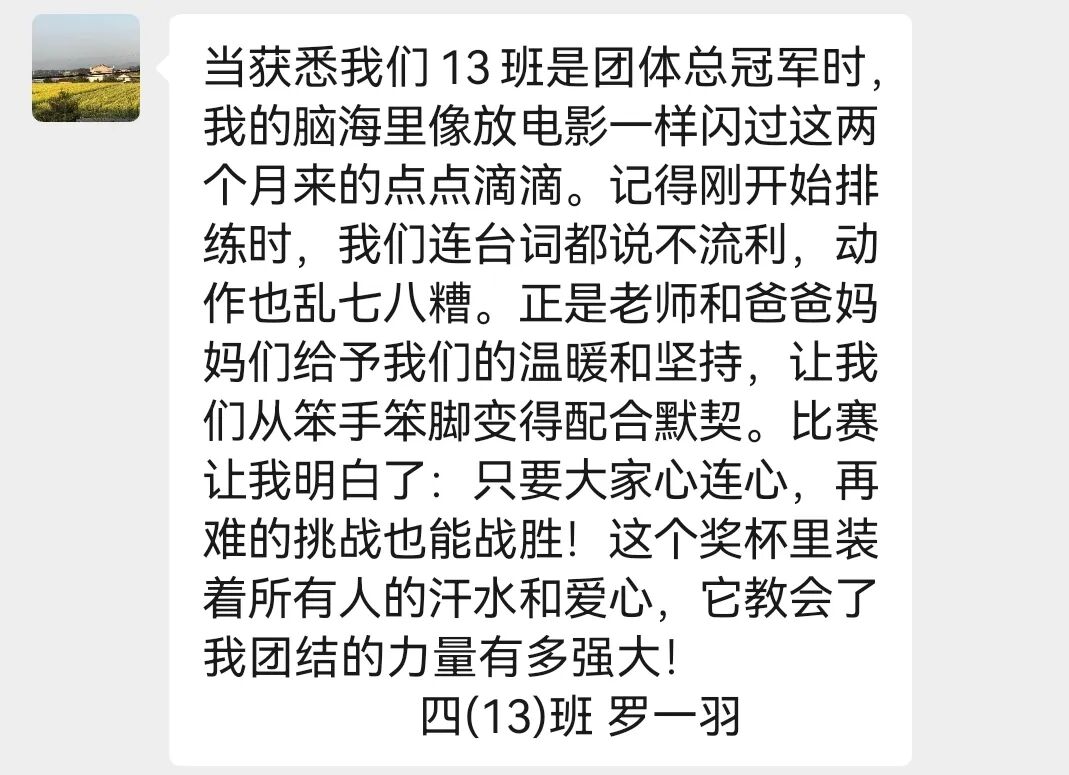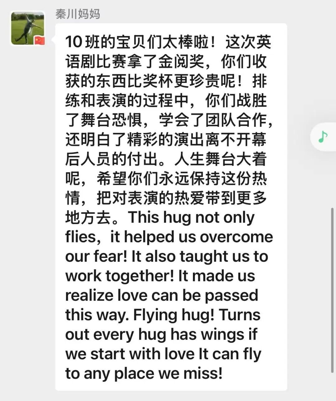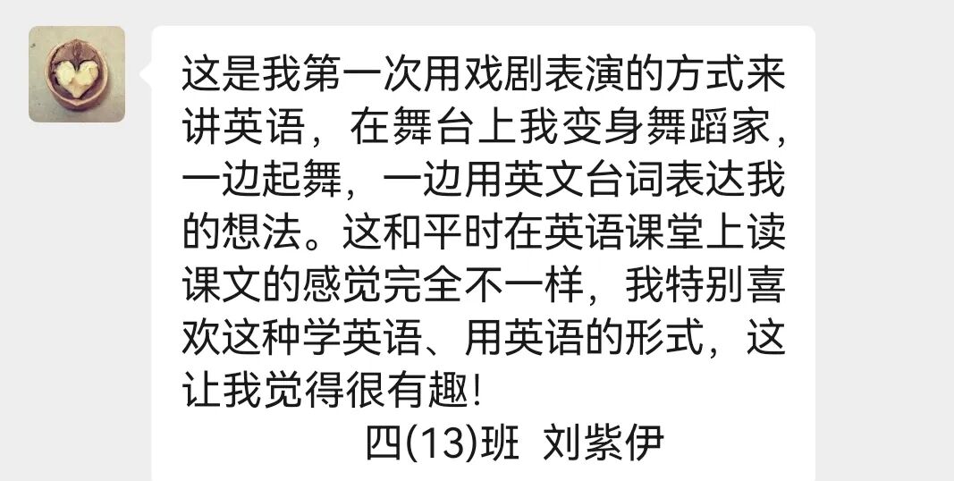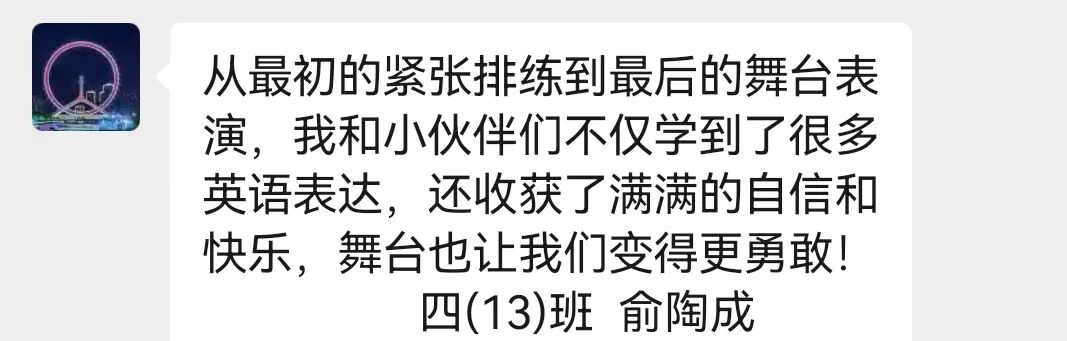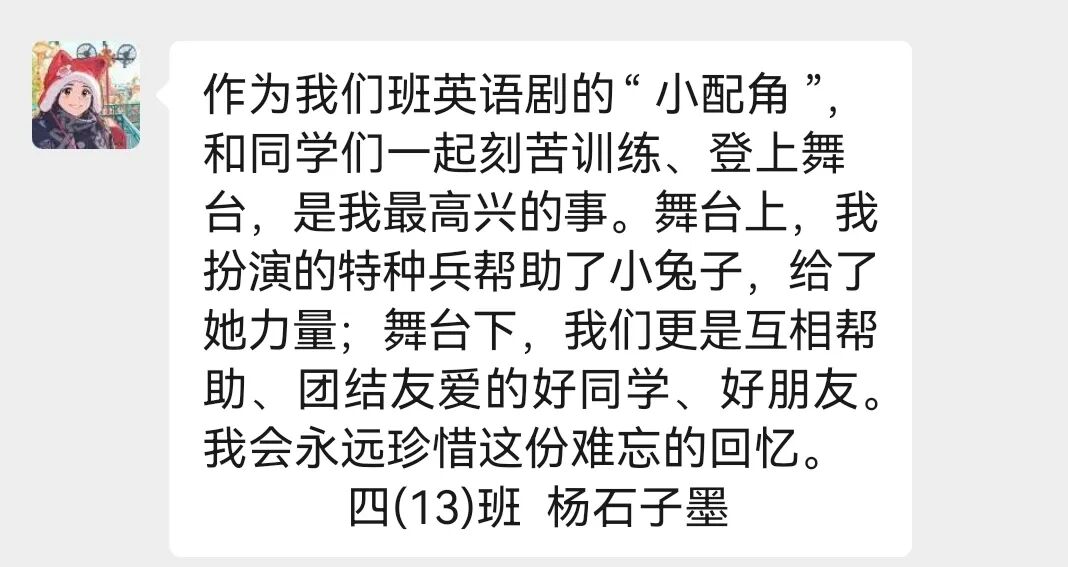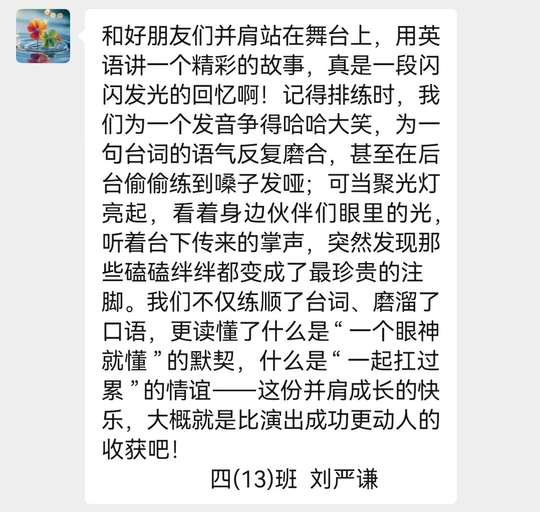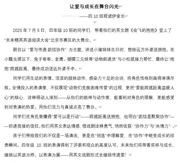 四10班英文剧《会飞的抱抱》亮相“未来精英”市赛获团体第四。该剧以“爱与传递”为主题,讲述小猪妹妹送拥抱给外婆的故事,“动物邮递员”接力传爱。同学们表演生动,诠释出爱能跨越距离。他们从中懂得爱与团结,收获协作力与共情力,未来将继续以戏剧传递爱。