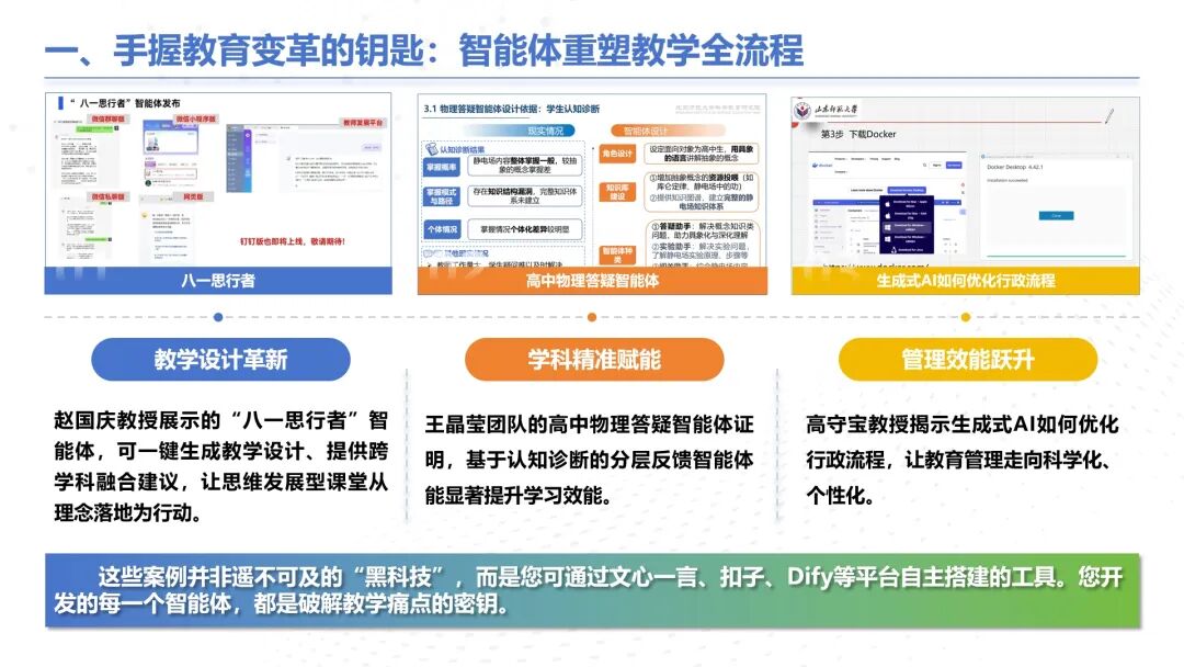 北京师范大学王晶莹教授表示,这些案例并非遥不可及的“黑科技”,而是老师们可通过文心一言、扣子、Dify等平台自主搭建的工具。老师们开发的每一个智能体,都是破解教学痛点的密钥。同时,她也提醒大家警惕“技术炫技”倾向,始终以教学质量和学习效能提升为根本目标。