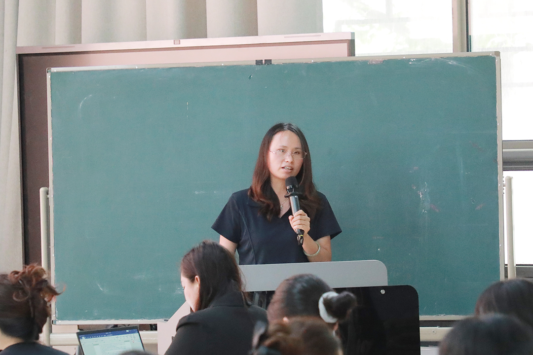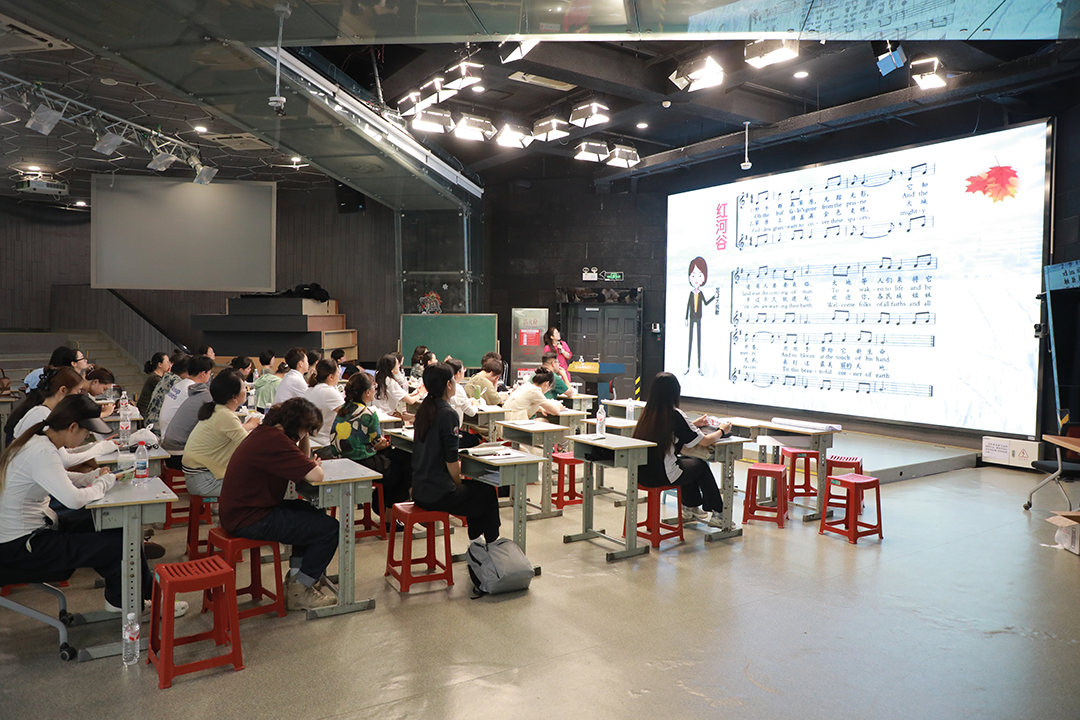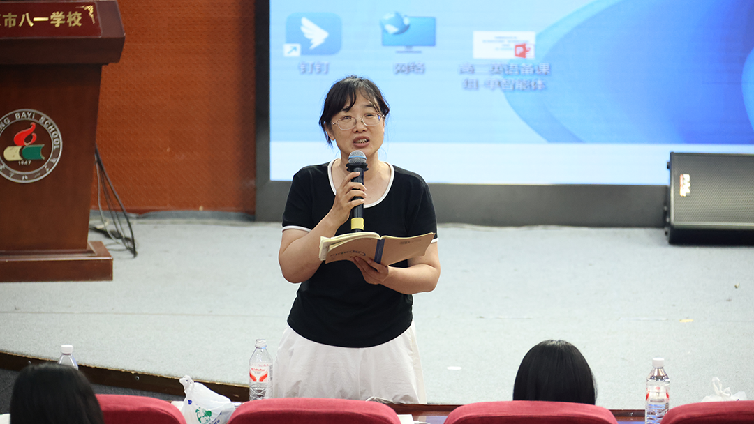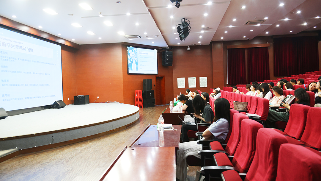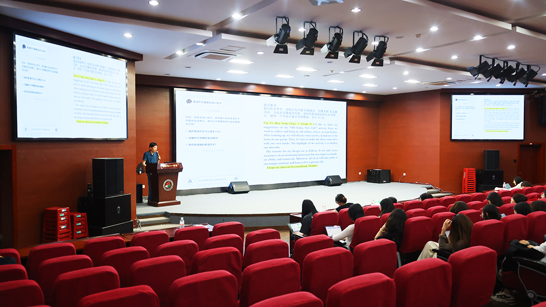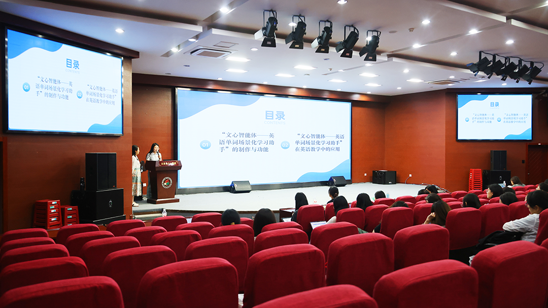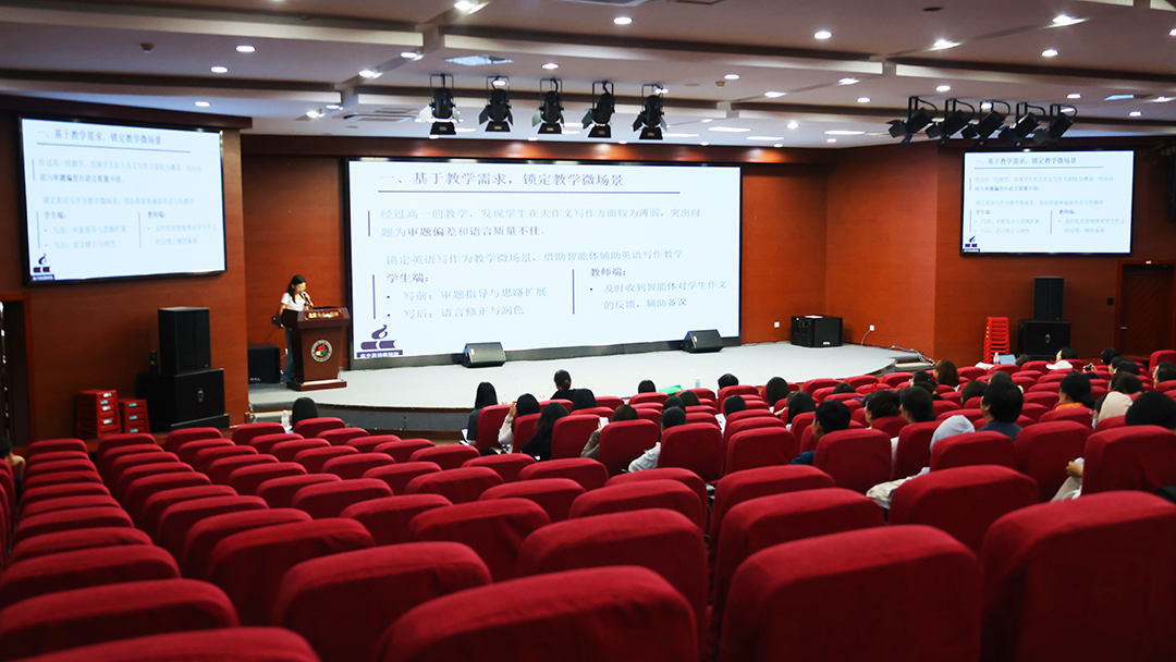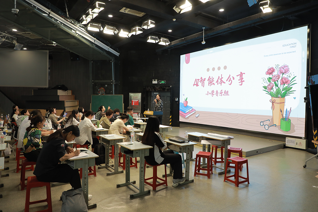 英语组全体教师于四阶梯教室,进行智能体开发学习成果交流与感悟。