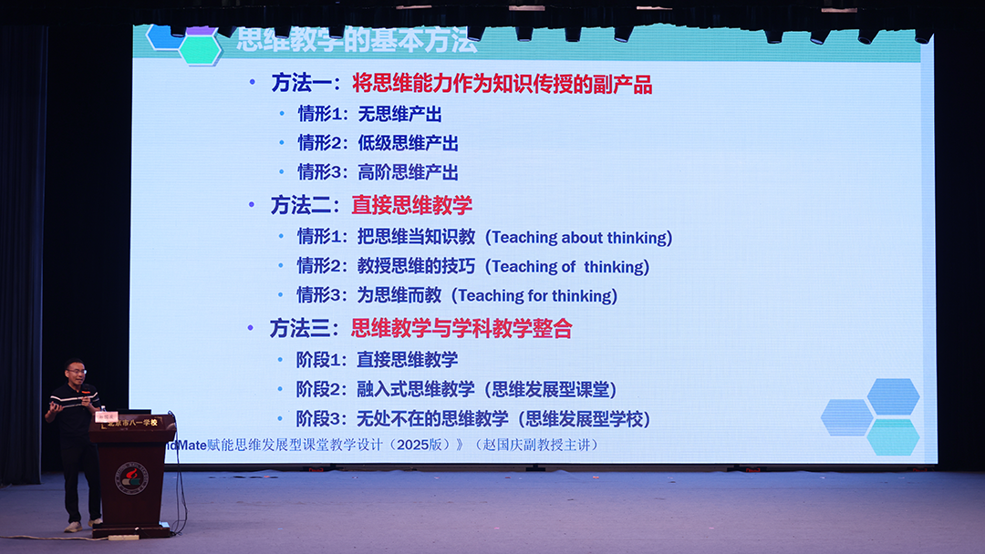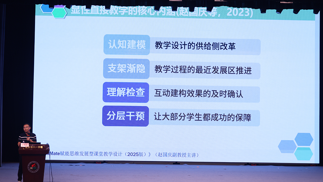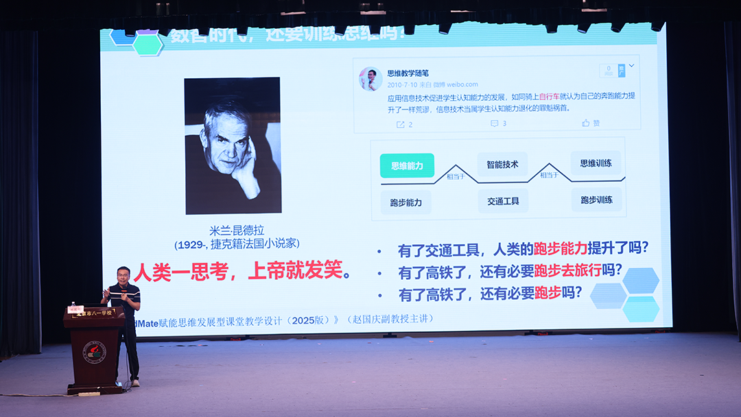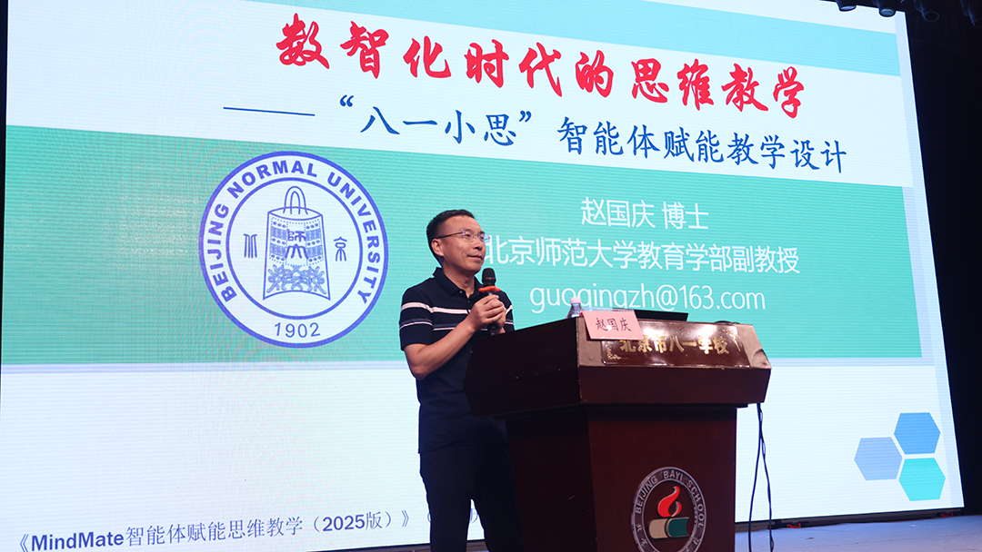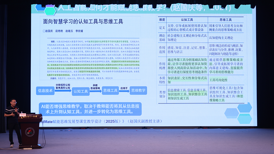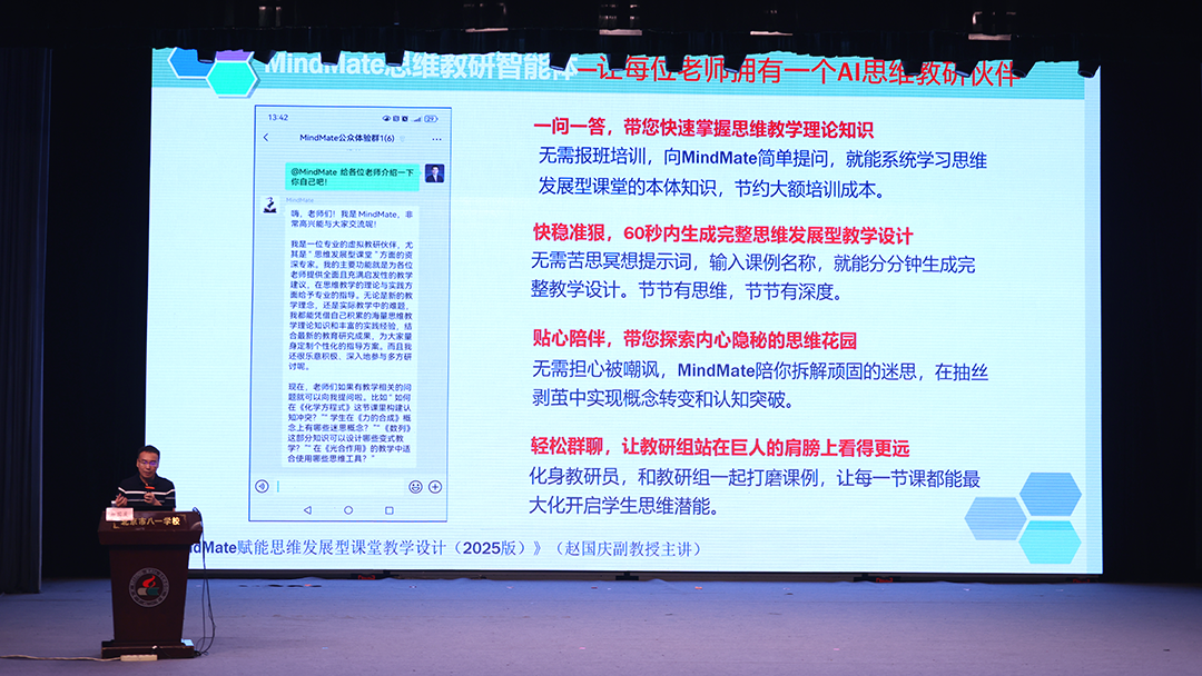 北京师范大学赵国庆教授,带来主题报告《数智化时代的思维教学:以“八一小思”智能体赋能教学设计》,深入探讨思维教研智能体在教学设计中的应用。赵教授提出“数智化时代,需要思维训练”,研究结果发现,人工智能的长期使用,削弱了长时记忆,替代了我们的高阶认知和创造能力。因此,现在的教育中更需优先培养评价能力以鉴别AI内容真伪。专业智能体则通过检索增强、垂直知识库和精细训练,有效解决大模型的“AI幻觉”问题,在教研领域超越通用模型。