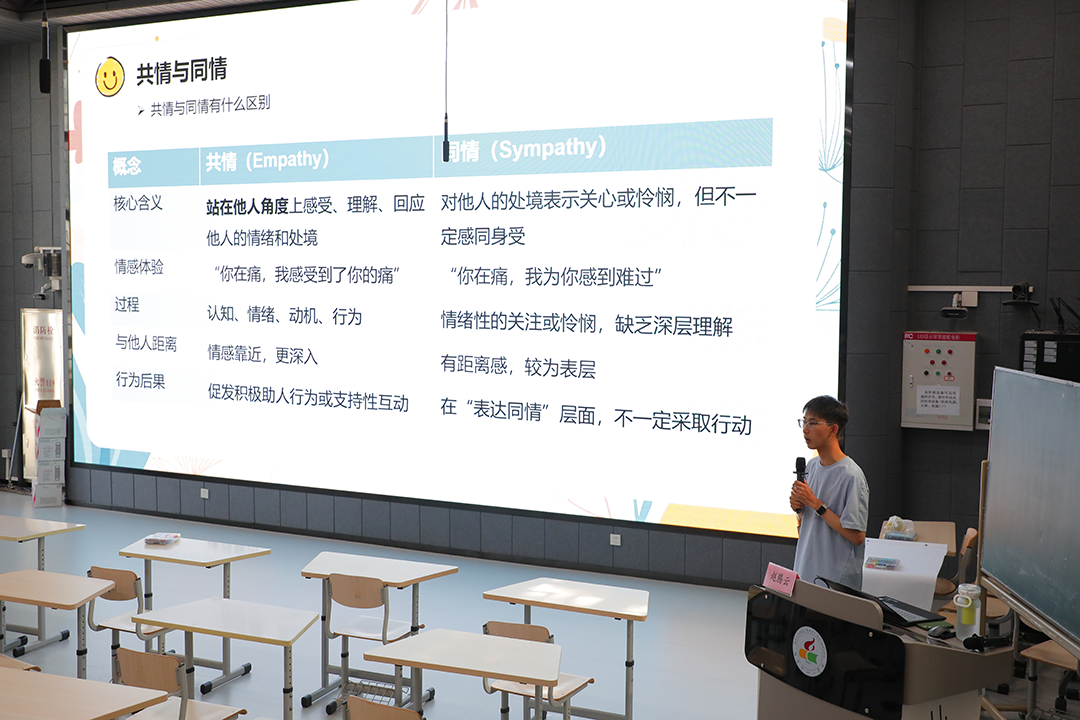 在行政教师培训并行工作坊里,中国科学院心理研究所研究生赵腾云和刘海龙,分别带领老师们开展《学校人际沟通中的情绪共情》培训。课程聚焦“教师共情能力教育实践建构”,通过理论讲授、课例剖析与沉浸式模拟体验相结合的方式,引导八一教师深刻理解“共情”在教育性人际关系中的核心作用,准确把握其在学生心理支持、师生沟通调节及教学互动优化中的实践价值,构建安全、尊重与支持性的教育环境。与会者从外卖员、家长与学生等多元情境中,体会换位思考与情感连接的力量。活动还介绍了“共情时间表”工具,帮助教师量化情绪、提升自我觉察能力,为教育心理健康工作提供了新思路。