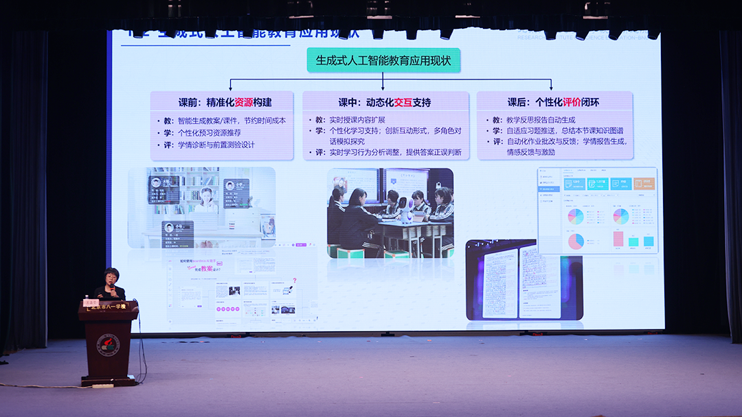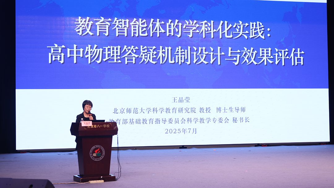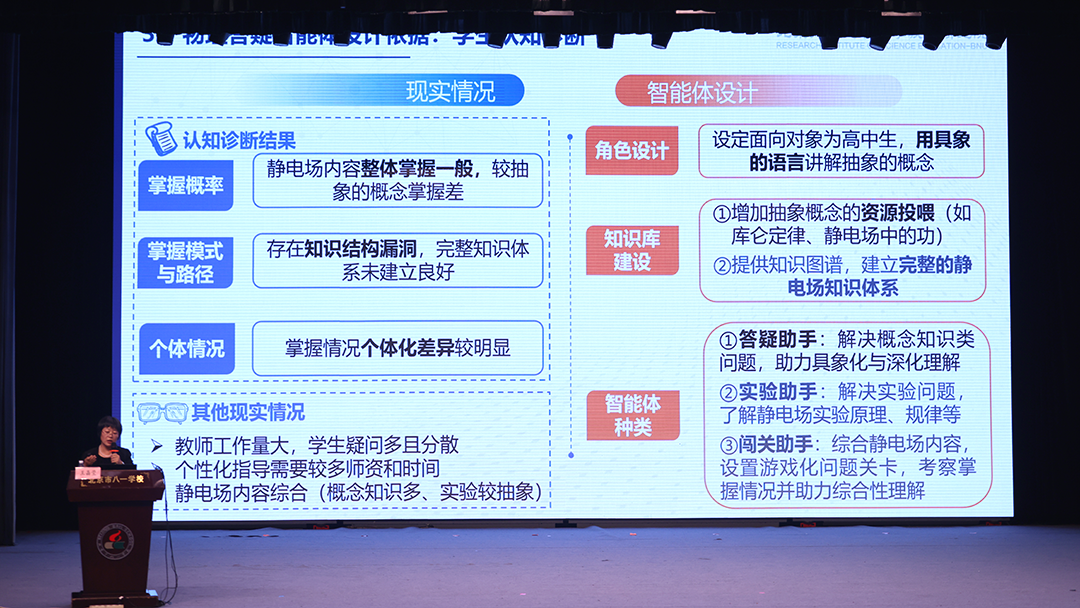 北京师范大学的王晶莹教授分享的是《教育智能体的学科化实践:高中物理答疑机制设计与效果评估》。王教授介绍了智能体的设计、开发与应用,强调了其在个性化学习、资源规划、智能测评和反馈方面的优势,与传统教学方法相比,能显著提升了教育质量和效率。