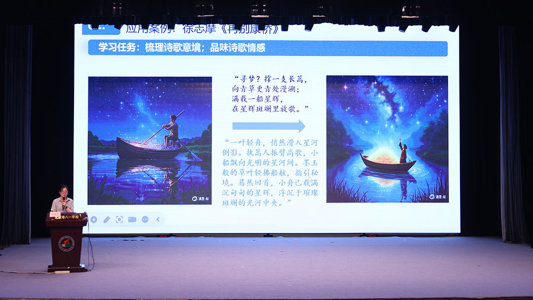 八一高中语文组常婧宜老师展示了 “阅读意境具象化智能体” ,该智能体巧妙运用可视化工具,将抽象的古诗文意境转化为具象可感的画面或互动场景,能显著提升学生的文本沉浸感与理解深度,让文学鉴赏更加直观生动。