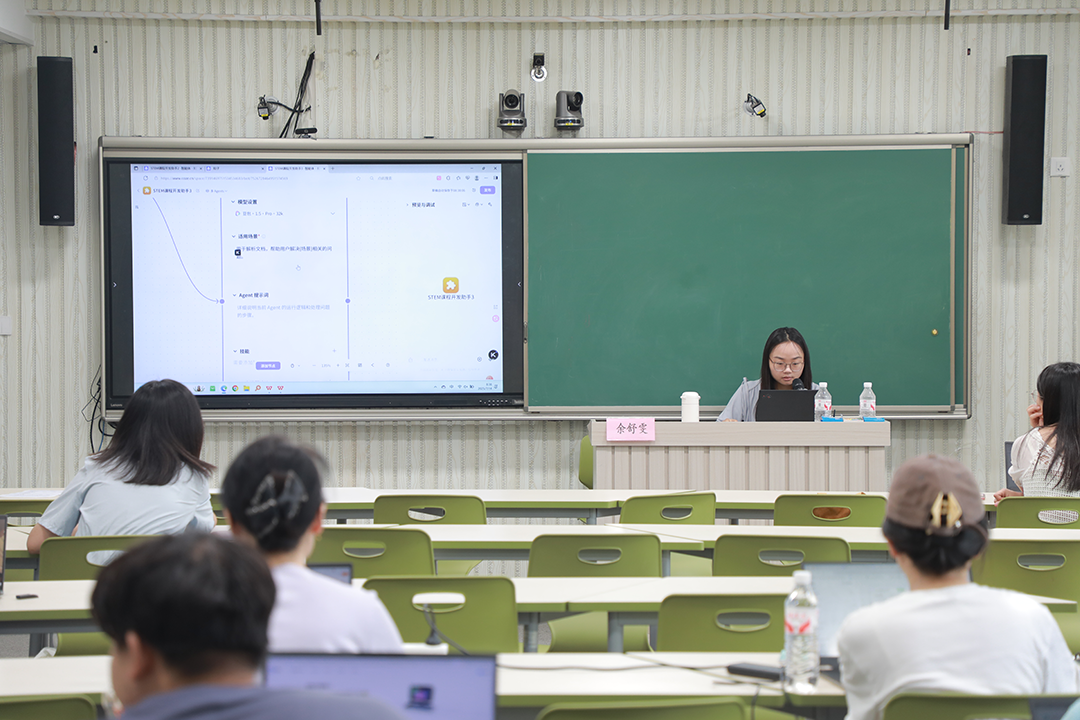北京师范大学余淑雯博士以“STEM 课程开发助手”为实例,系统演示了多智能体创建的完整流程。她先细致讲解并操作文档解读单智能体的创建,从基础参数配置到功能调试均逐一说明,在此基础上逐步引导教师掌握开发课程智能体的核心要点,使参训教师清晰把握多智能体构建的基本逻辑与实施步骤。
