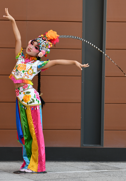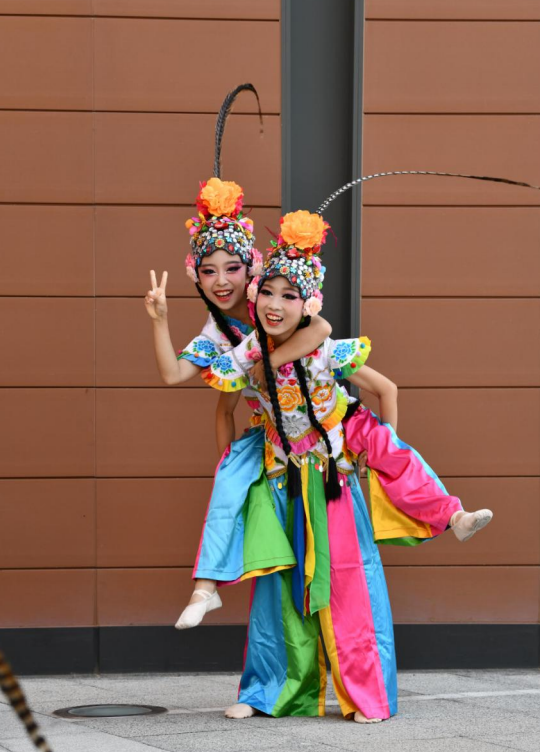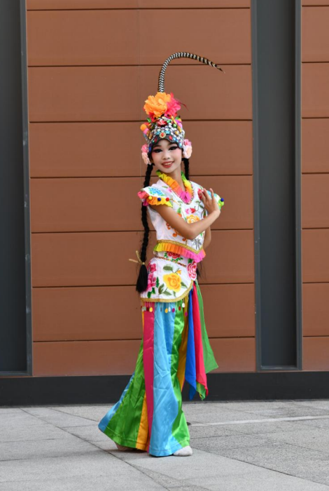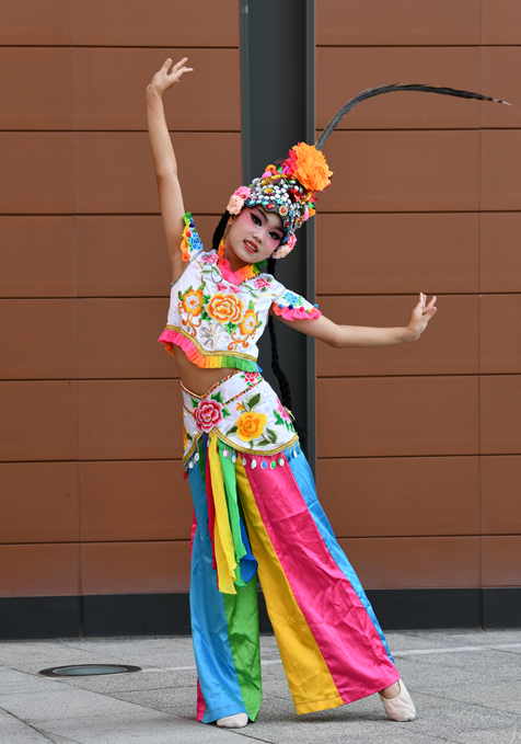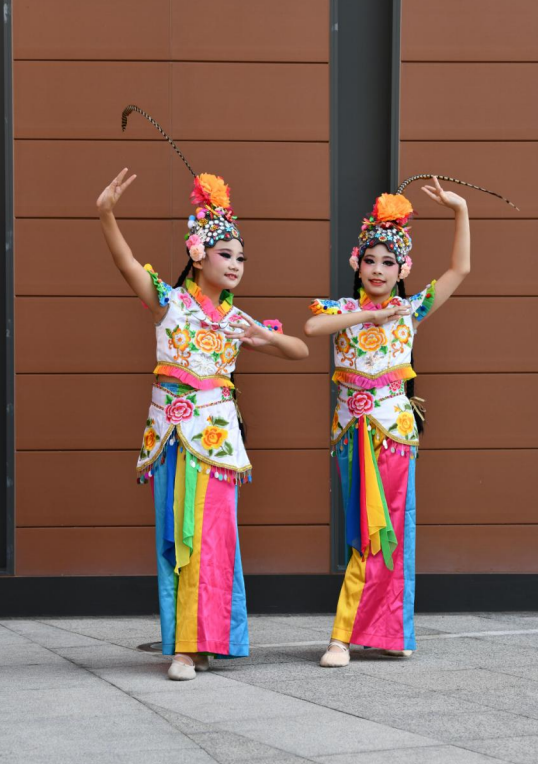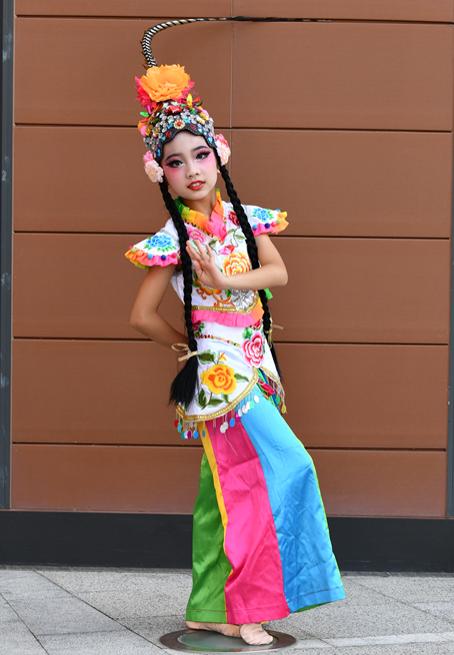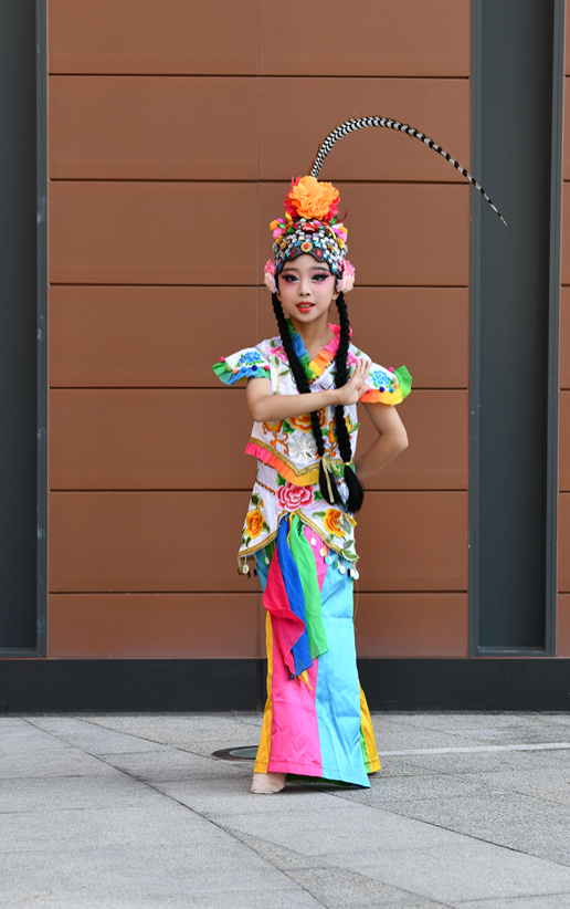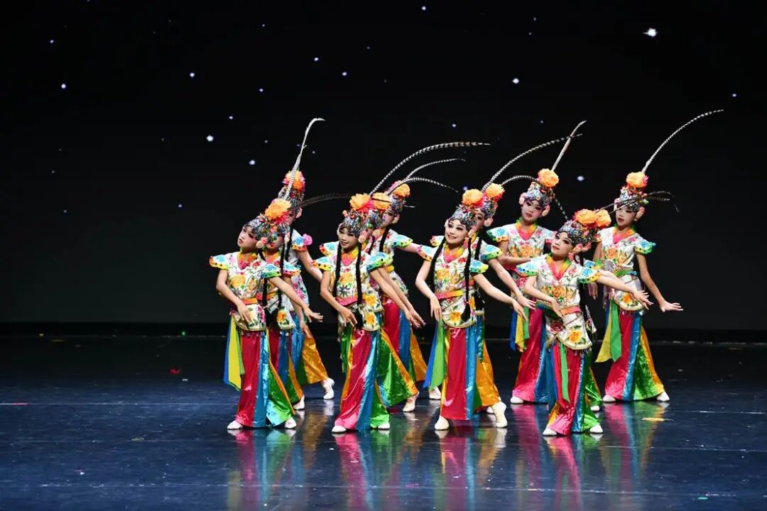 舞台上,身着绚丽舞服的同学们化身“俏花旦”,头顶的翎子随着舞姿灵动翻飞。乐曲响起时,她们或轻转身体让翎子划出优美弧线,或颔首浅笑让翎子微微颤动,或列队变换队形让翎子如波浪般起伏,一颦一笑、一动一静都将花旦的俏皮与灵动展现得淋漓尽致。