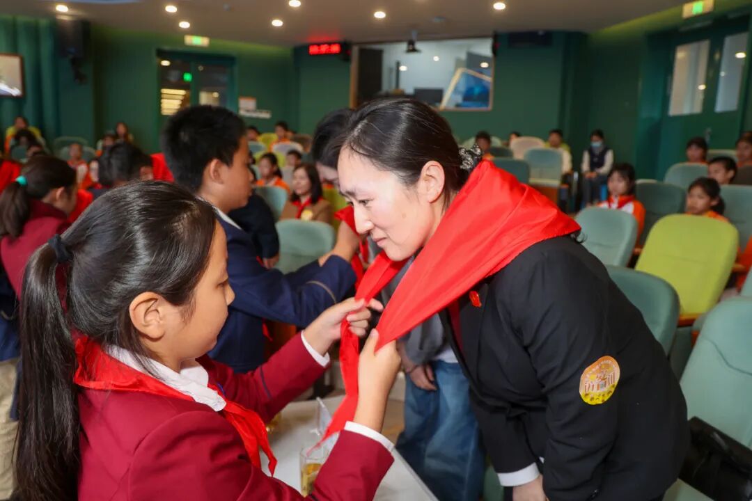 少先队员代表为参会领导嘉宾佩戴红领巾