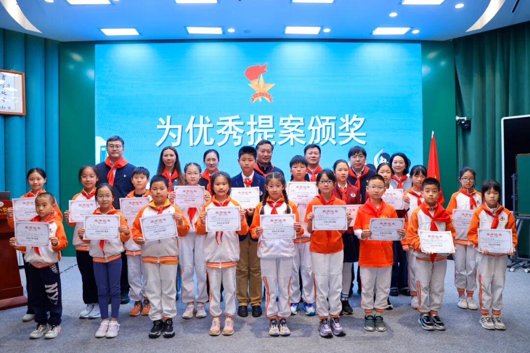 与会领导嘉宾为优秀提案的中队颁发证书。这份荣誉不仅是对队员们智慧与责任心的肯定,更激励着全体队员继续关注生活、积极思考,用“小提案”承载“大智慧”,一起创造葵园更美好的未来!