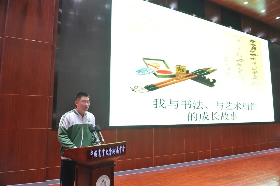 秦立人同学分享的《我与书法、与艺术的成长故事》。讲述了他从初学书法的生疏到逐渐热爱的过程,切身体悟到艺术不仅提升审美素养,更能塑造坚持与专注的品行。他的分享,正是学校美育浸润、助力学生成长的生动缩影。