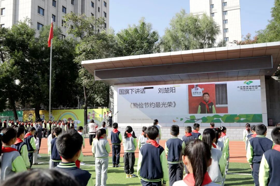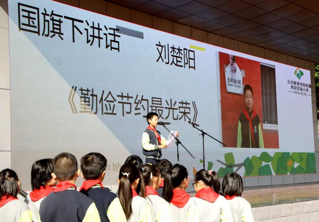 刘楚阳在国旗下讲话中向大家介绍了世界勤俭日。每年10月31日是世界勤俭日。设立这个节日旨在号召全球人民勤俭节约,珍惜现在来之不易的宝贵资源。勤俭节约,是中华民族的传统美德,它是一种生活智慧,更是一份时代责任。作为新时代的小学生,我们更应从身边小事做起,节约用纸,随手关灯,践行“光盘”行动,理性消费。让我们珍惜资源,传播节约理念,共同营造节约环保的社会环境,为构建美好家园贡献一份自己的力量。