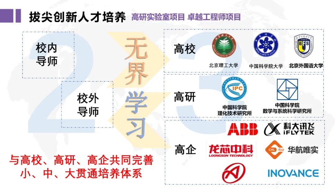 在学习模式与思维转变方面,以解决问题为导向开展项目式学习,积极推动学生的学习角色、策略、思维转变;课程设计方面,推出阶梯式贯通培养计划,为学生设计多元发展立交桥;平台支撑方面,北京理工大学附属中学不仅开设了高水平艺体科技课程,还提供了大学先修平台及个性化的竞赛、强基课程。此外,学校与北理工、国科大等知名高校合作,共建了五大领域的11个高研实验室,创新人才培养全面对接北京市“翱翔计划”等四大平台,为每一位学生的成长提供坚实支撑。