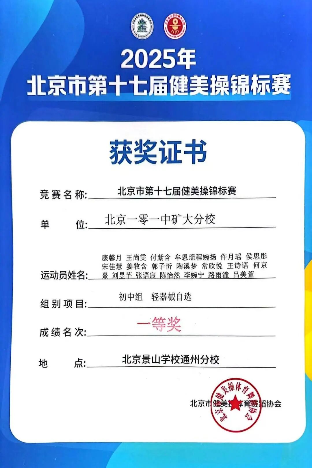 2025年11月1日,北京一零一中矿大分校初中健美操队参加由北京市健美操体育舞蹈协会主办,北京景山学校通州分校承办,北京市健美操体育舞蹈健美操专业委员会协办的2025年北京市第十七届健美操锦标赛。