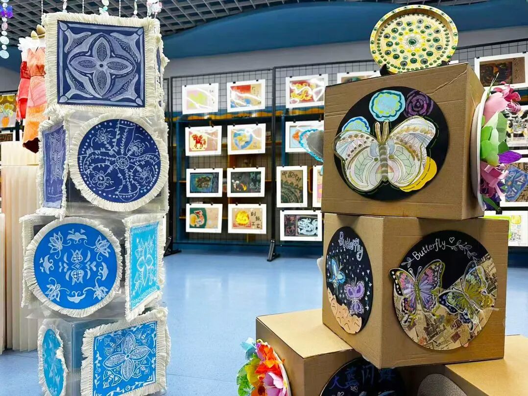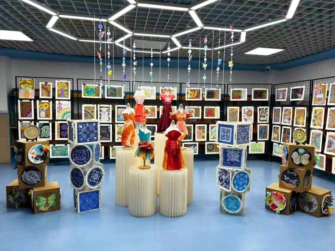 拾级走向二、三层展厅,仿若闯入传统与创意共舞的天地。孩子们稚嫩的小手藏着惊人想象力,将心底情愫与梦想晕染在纸间。看,精致服饰设计诉说古老美学,蜡染蓝白纹路流淌时光温柔,蝶绘翅羽似要振翅高飞;还有摇曳花草、镂空剪纸、点彩刻纸、纹样繁复的中国风创作及憨态面塑……传统技艺在孩子指尖被唤醒,焕发生机。跳跃的抽象色彩、天马行空的构图,将孩童无边想象尽数呈现。