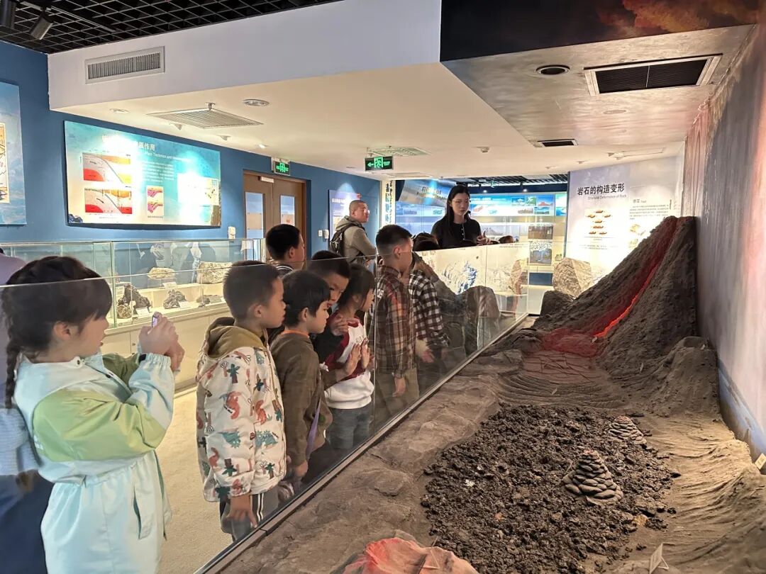 同学们有序参观地大逸夫楼的地球展厅,从地球的神秘内核到壮丽的地表地貌,仿佛一秒穿越到板块运动的现场!冰川、泥石流,火山,溶洞等大自然的鬼斧神工尽收眼底。
