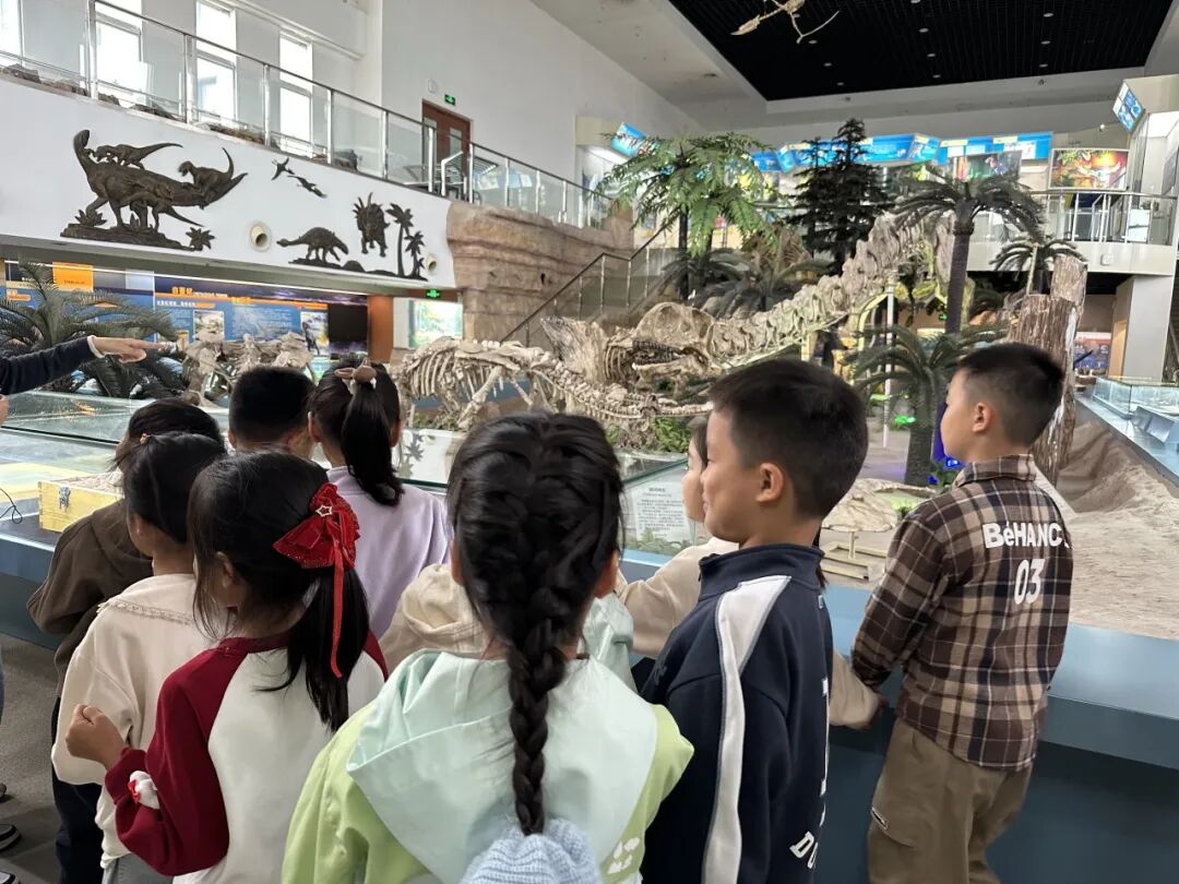 在恐龙展厅,同学们一进门就被巨大的恐龙骨架化石震撼住了。这只巨龙仿佛在欢迎这些小小探索家。“哇!这只恐龙好大啊!”“它的脖子好长啊!”同学们瞬间沸腾了,纷纷仰起好奇的小脑袋,围着这只叫“马门溪龙”的大家伙参观,眼睛里全是惊奇和崇拜。一只只小手比划着,很难想象地球上曾经生活过如此巨大的生物。站在它脚下我们好小好小,不由得对生命的演化充满了好奇。