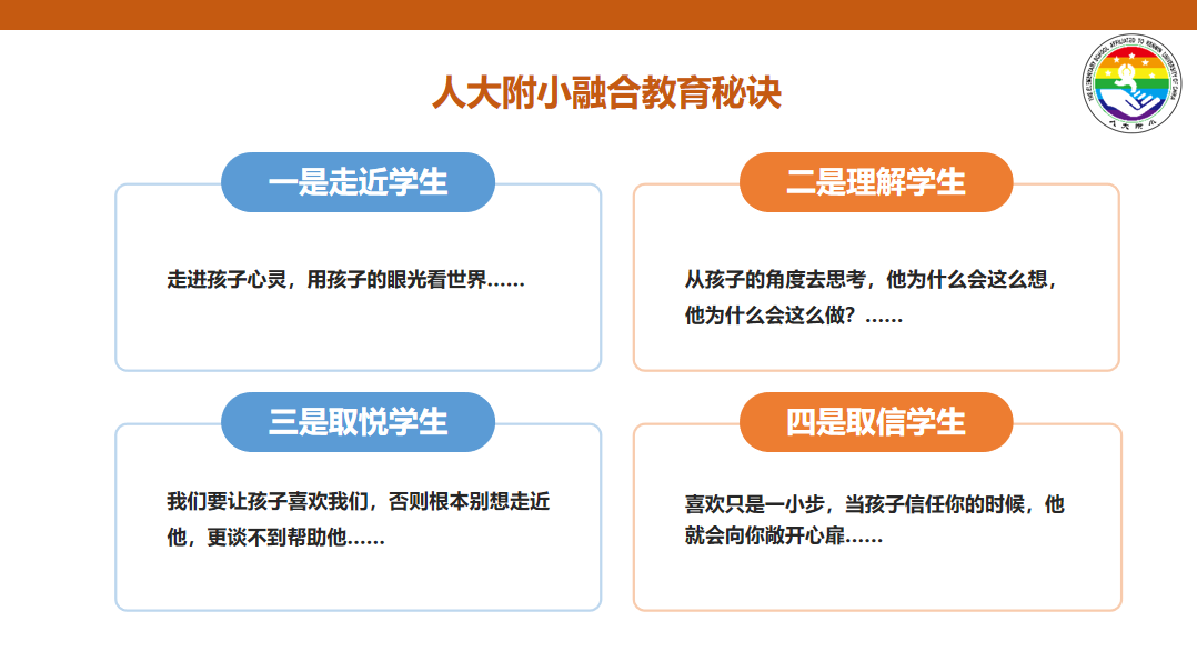 在校长主题报告环节,海淀区特教中心主任、北京市健翔学校校长王红霞受邀主持,与全国同行共话特教发展。上海市徐汇区求知小学、中国人民大学附属小学、上海市虹口区特殊教育指导中心、西南大学特殊教育学院副院长等嘉宾,分别从脑智技术应用、区域特教实践、融合课堂探索、融合课程建设等维度分享经验。