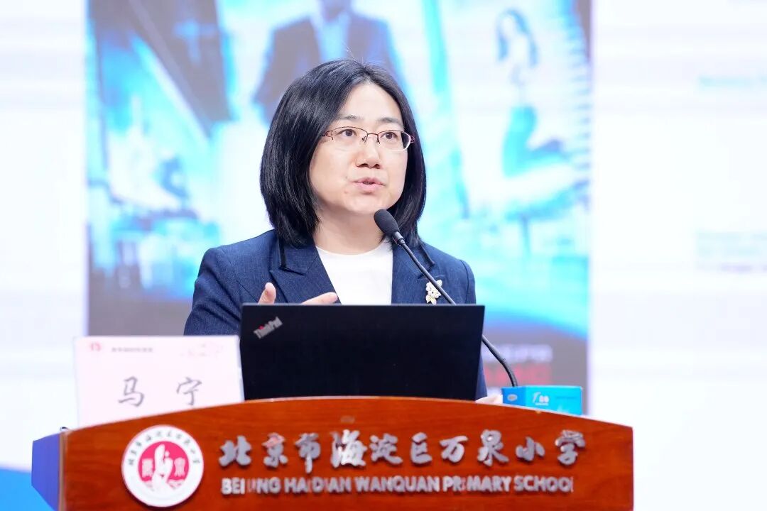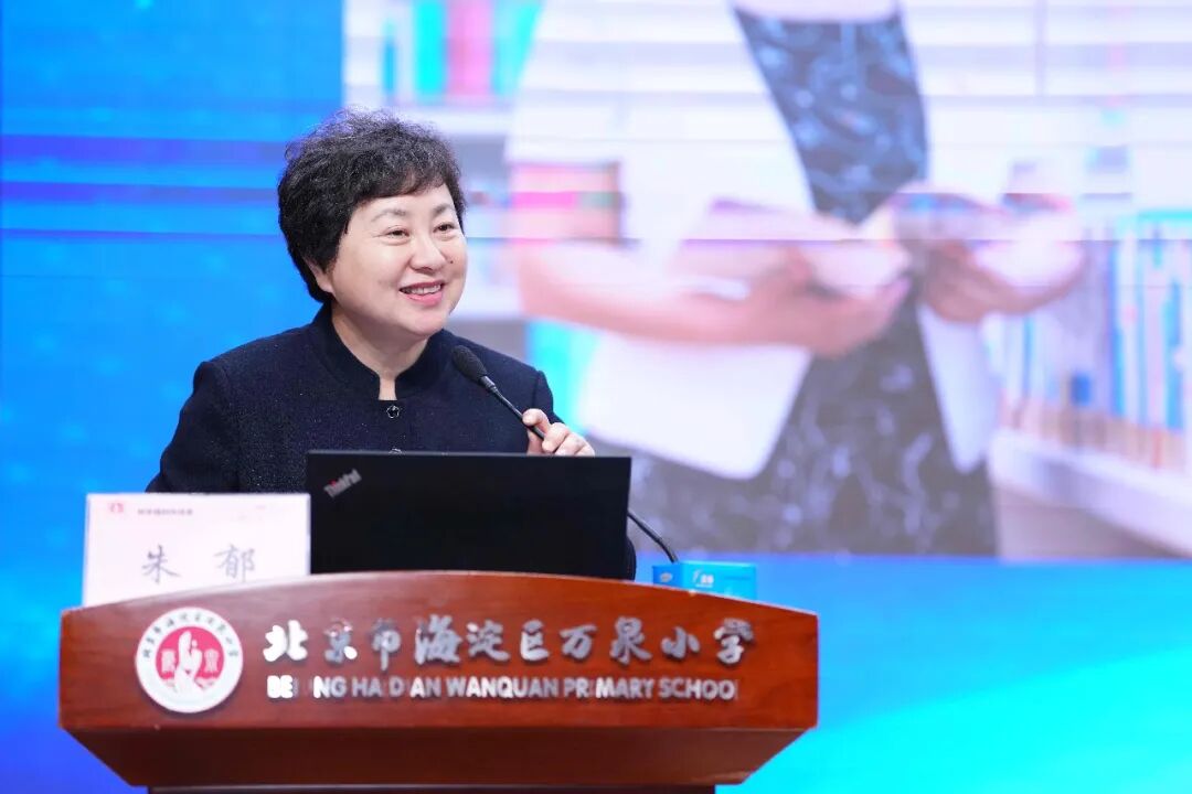 万泉小学教育集团党委书记朱郁致欢迎辞。她首先对与会的各位领导、专家及教育同仁表示诚挚欢迎,并感谢北京市数字教育中心、海淀区教科院的悉心指导,以及合作伙伴的长期支持。她强调,作为始终追求教育品质的学校,万泉小学近年来在人工智能赋能教学创新方面进行了一系列积极探索。本次研讨会既是对学校前期探索实践的集中展示,更是难得的学习提升机会,期待通过此次活动,为AI赋能教学创新指明方向、提供方法、注入新动力。