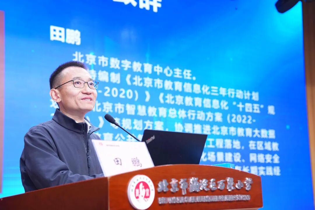 北京市数字教育中心田鹏主任致辞。他指出,AI是国际科技竞争制高点与国家战略领域,对教育影响重大,教育需借AI变模式、内容等以培养适应未来的人才。田主任认为,在具体实施中,教育工作者需坚持战略引领、小切口应用、系统推进、守住安全底线。他还表态,北京市数字教育中心将一如既往地为破解教育发展难题、服务一线师生提供支持,助力教育数字化转型工作稳步推进。