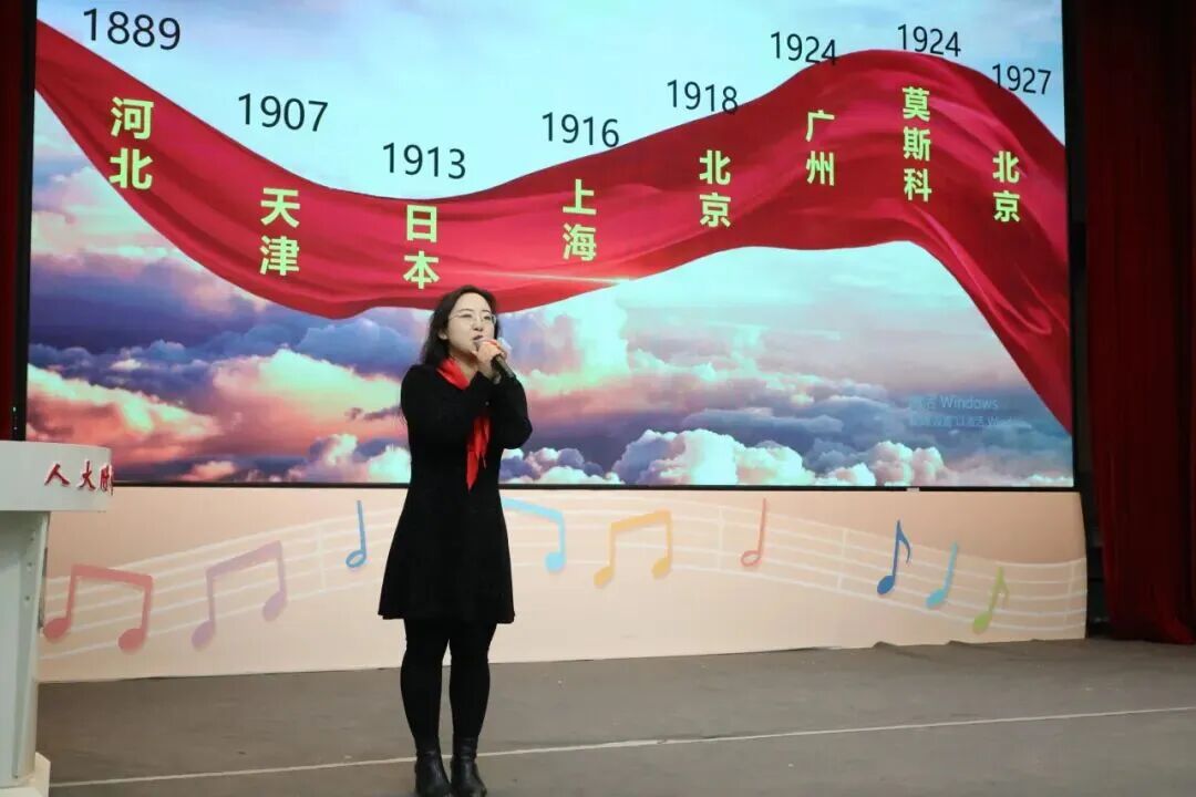 人大附中翠微学校大队辅导员廉梦圆老师带领在场队员、入团积极分子和辅导员们重温大队开展过的学习李大钊精神的相关活动。