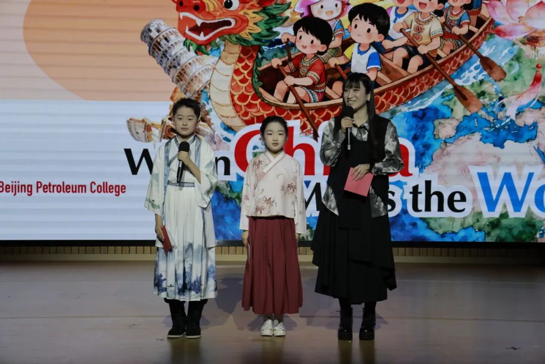这一天,校园变身活力满满的文化交流乐园,舞台展演与互动体验同步开启。舞台上,各年级学子轮番登场,用流利英语演绎中国故事:低年级音乐剧活泼灵动,传递传统美德;传统服饰秀上,孩子们身着汉服、唐装自信走秀,英文童谣与服饰文化相得益彰;中年级短剧串联神话传说,英语朗诵歌颂山河之美;高年级创意融合节目引发全场共鸣,以“少年强则国强”齐诵推向高潮,颁奖环节为孩子们的创意送上真挚肯定。