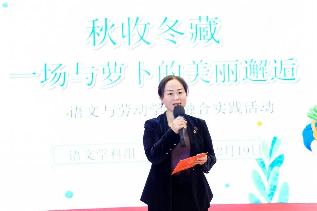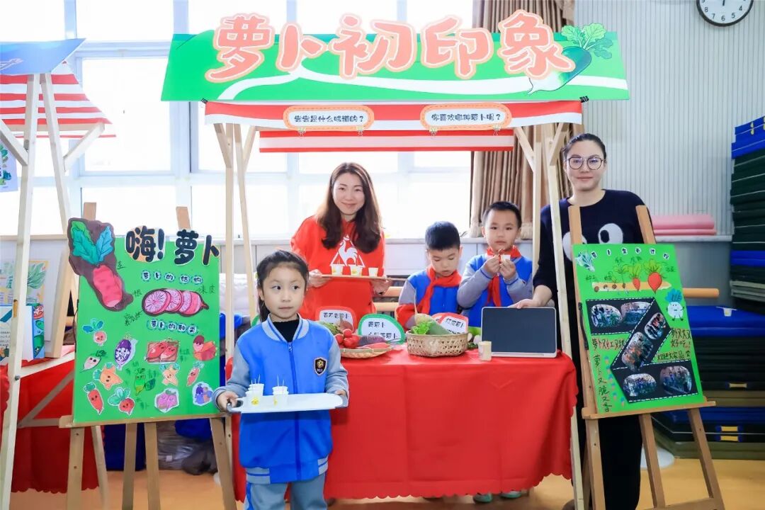 “萝卜奇遇记”,让文化在劳动中生根。语文学科以“萝卜奇遇记”为主题开展学科融合实践。低年级通过情景剧演绎生长过程,中年级以相声方言介绍各地食俗,高年级则进行雕刻创作与文创设计,让传统文化在劳动实践中焕发新生。