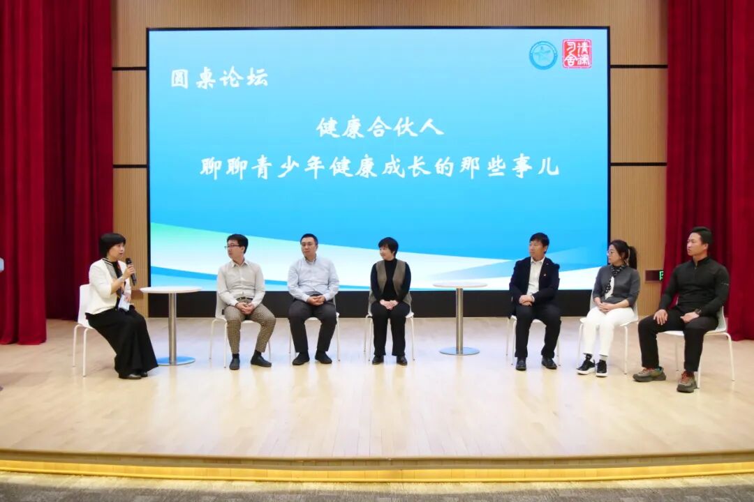 思想的火花在专题讲座后继续碰撞。圆桌论坛环节,学区管理中心副主任金丽春与主讲专家、海淀区上庄学校党总支书记韩杰、体育教师叶干明、建华实验学校家长代表张琳琳,围绕青少年健康成长话题展开交流。论坛嘉宾以各自不同的视角,从医学角度的科学干预到体育运动的实践探索,从家庭餐桌上的营养搭配到孩子日常的行为习惯养成各抒己见。现场交流既有专业高度,又充满人文关怀,引发了听众的强烈共鸣。在场的教师和家长们也积极参与到话题讨论中。大家一致认同,守护青少年健康,需要家校社形成合力,共同承担起“健康合伙人”的责任,为孩子的健康成长保驾护航。