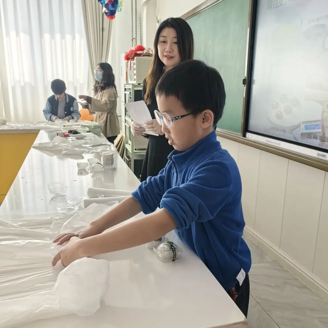 别看我们年纪小,做起事来那叫一个认真:小心翼翼地取面、学着大人的样子上秤称重、把甜甜的豆沙馅紧紧包进去、最后再像变魔术一样把它包装好……