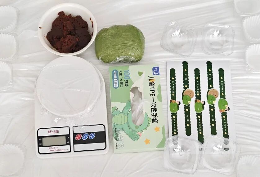为了让孩子们玩得尽兴、吃得放心,阿姨们提前好久就开始张罗:细腻绵密的豆沙馅、雪白的糯米粉、精准的厨房秤、还有那必不可少的一次性手套……各种食材和工具摆上桌,孩子们的眼睛瞬间就亮了。