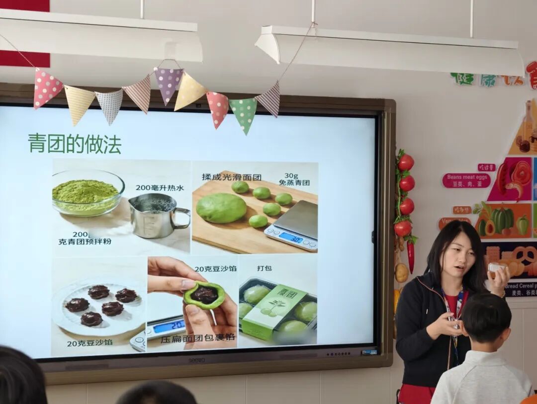上课铃一响,“高老师”登场!高阿姨先是化身“美食主播”,给孩子们详细讲解了青团的“前世今生”以及制作秘籍。从怎么给面团称重,到馅料该放多少,再到最后怎么收口不露馅,讲得明明白白。