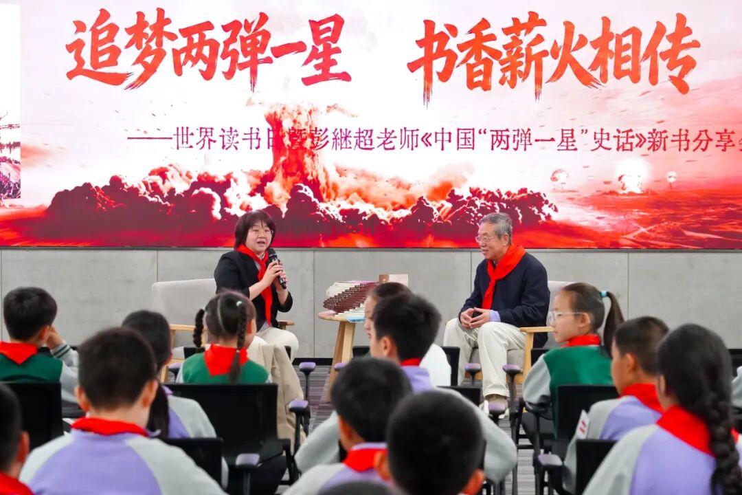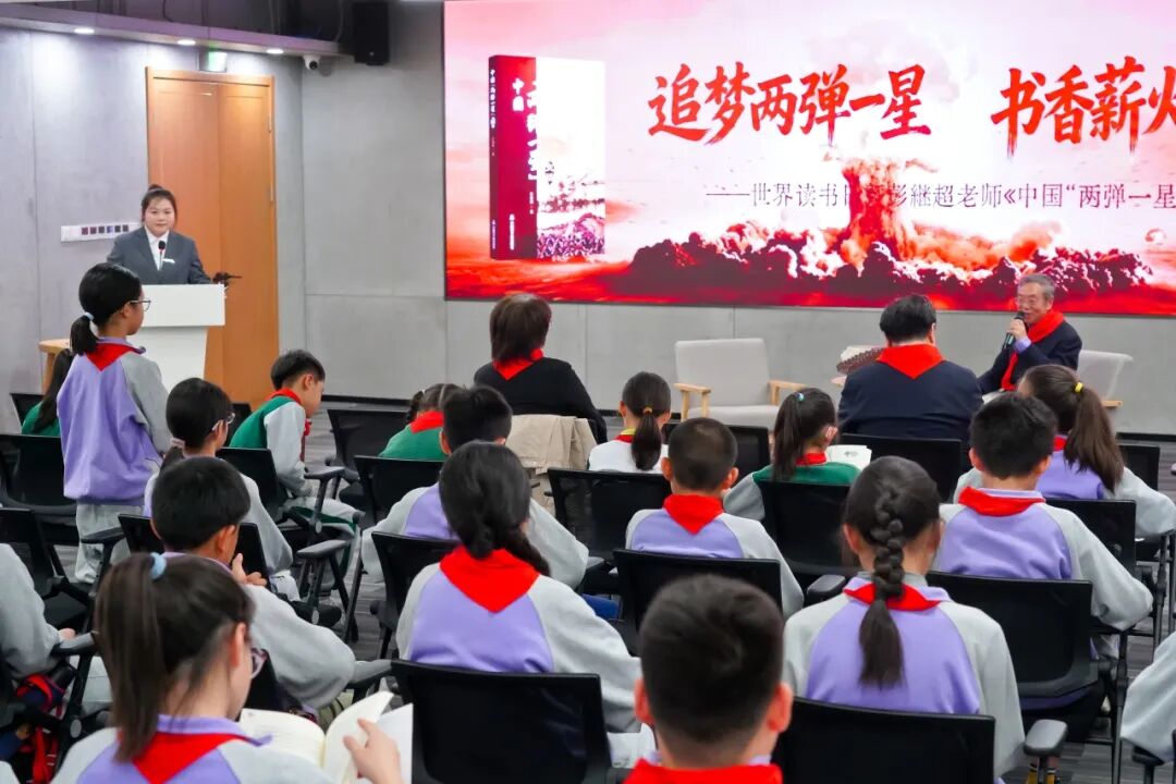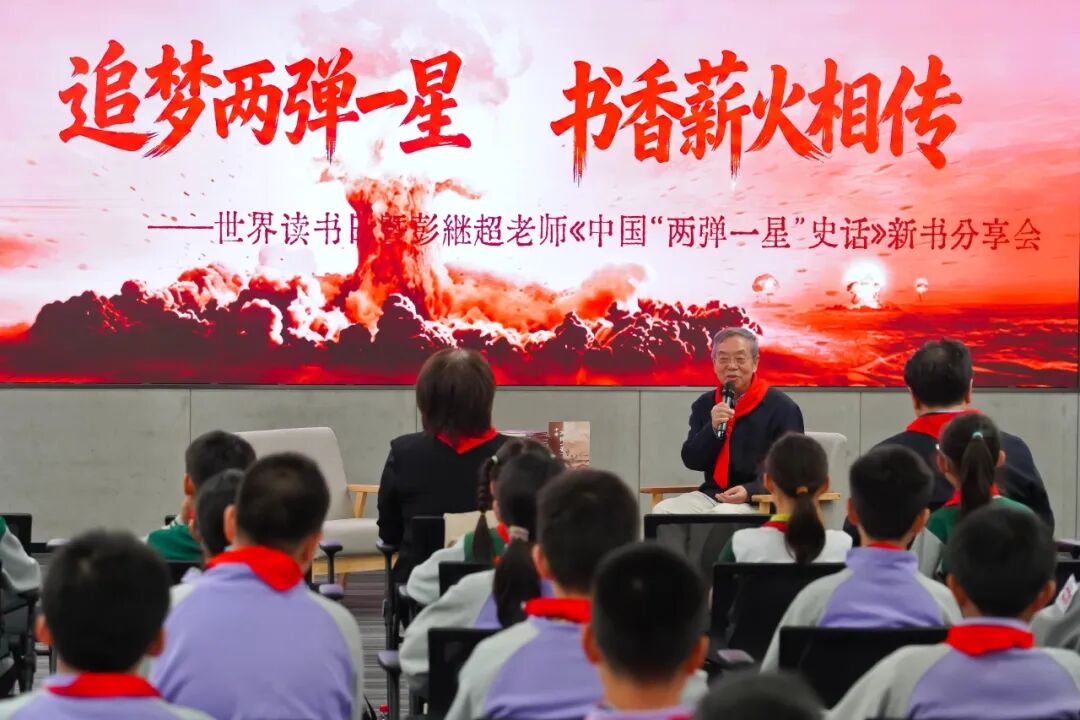 读书传薪火,精神永流传。作为世界读书日的核心环节,活动现场重磅举行 《中国“两弹一星”史话》新书发布仪式。中国人民解放军总装备部政治部一级作家、“两弹一星”在海淀专家委员会副主任彭继超老师,他17岁参军入伍,此后近三十年扎根新疆罗布泊核试验场,亲历了中国核试验与航天事业最激荡的年代。彭老师结合世界读书日主旨,深情讲述新书创作背后的故事,分享挖掘 “两弹一星” 历史细节的初心与感悟,引导师生以红色阅读为纽带,在字里行间触摸历史脉搏、感悟精神力量,让红色书籍成为传承“两弹一星”精神、坚定理想信念的重要载体,让读书日真正成为弘扬红色精神的“精神盛宴”。