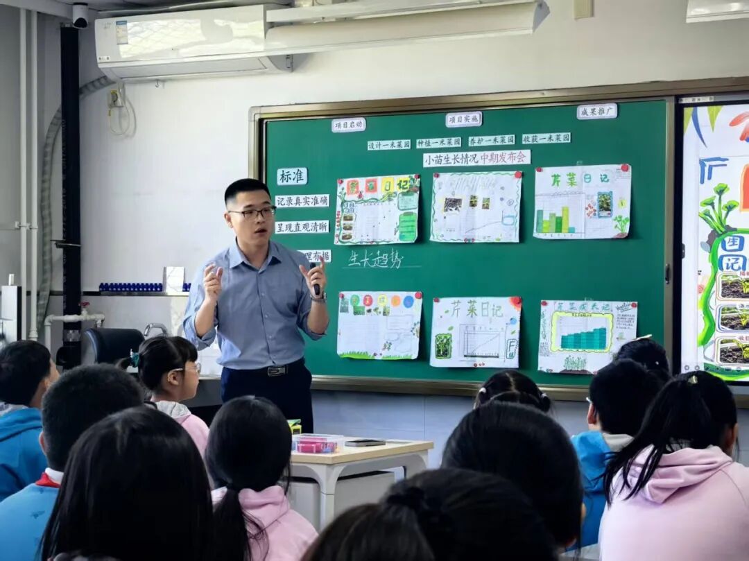 本课是万泉小学四年级跨学科项目式学习课程,以 “一米菜园” 种植实践为载体,学生亲历试种、移栽与长期养护全过程,用数据追踪植物生长轨迹,将数学 “折线统计图” 知识与科学植物探究有机结合。通过自主记录、绘制图表、小组海报互评、数据对比分析,学生不仅掌握统计方法,更能用数据解释生长规律、分析环境影响,完成从实践到数据再到科学论证的完整项目闭环。课程以真实问题驱动学习,培养数据分析观念、科学探究精神与跨学科解决问题的综合能力。
