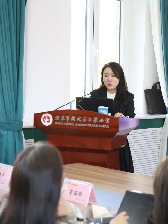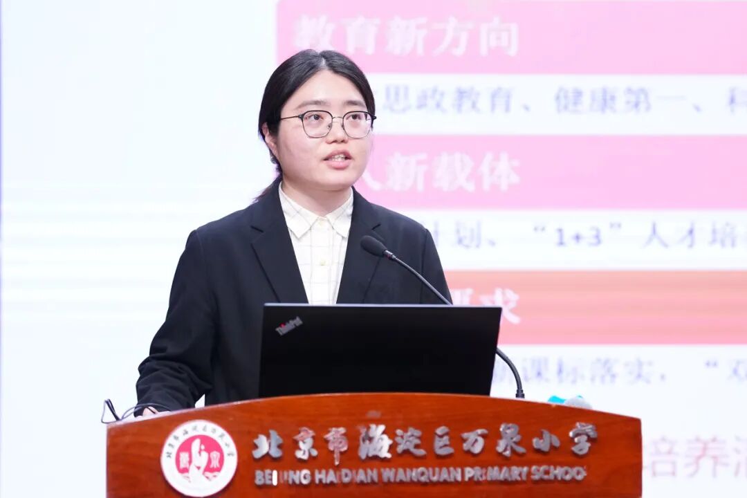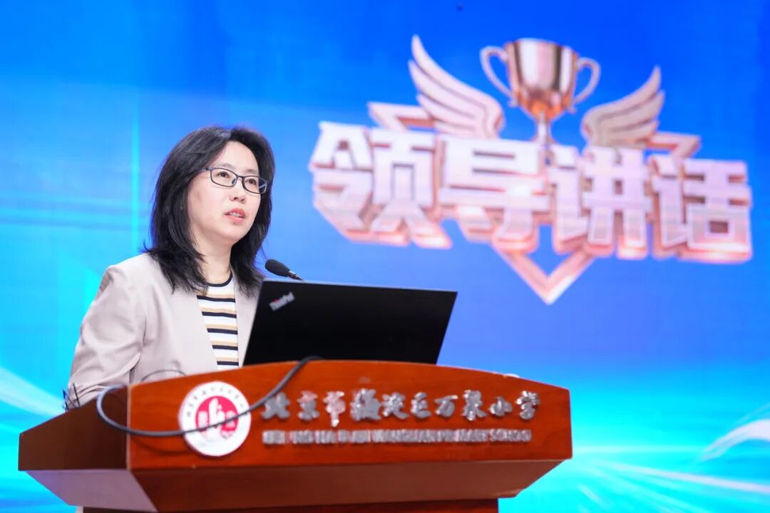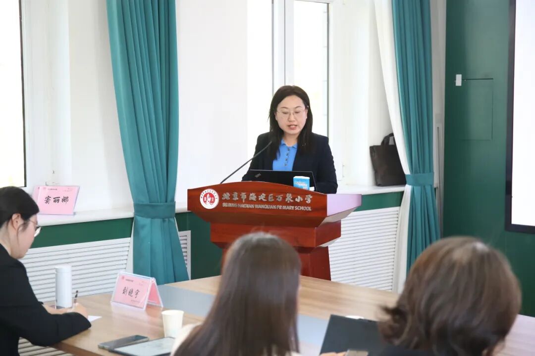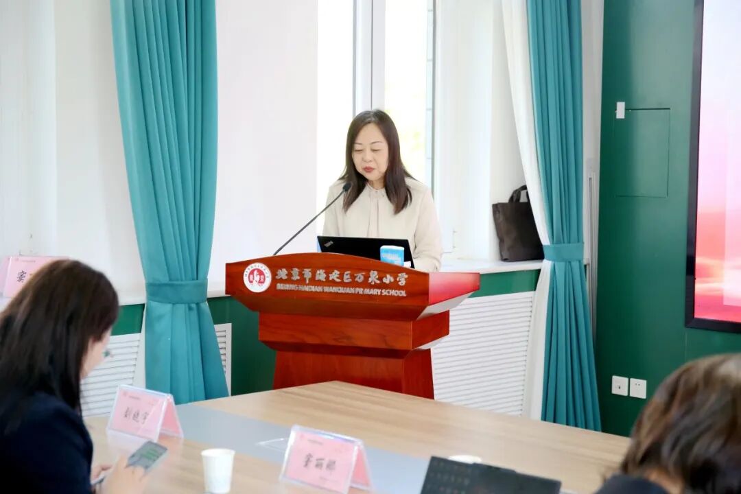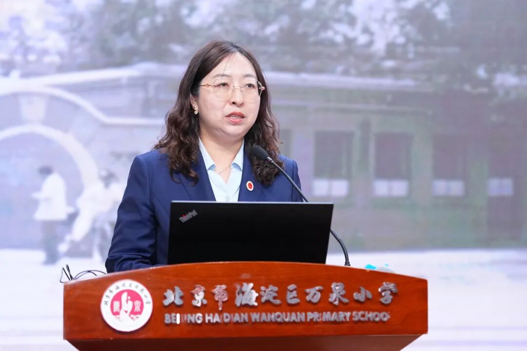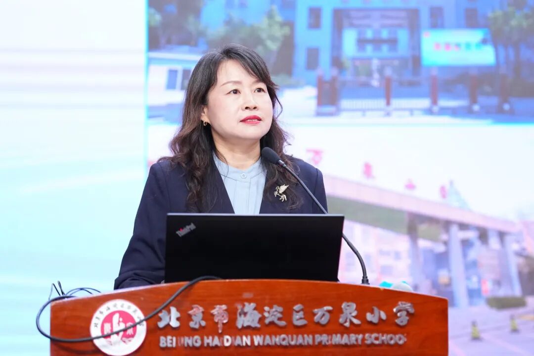 海淀区万泉小学教育集团党委书记朱郁致欢迎辞。她代表全体师生向各位领导、专家的莅临表示最热烈的欢迎和最诚挚的感谢。朱郁书记指出,万泉小学作为一所扎根海淀、深耕育人的近百年老校,始终坚守“营造绿色教育生态,传递教育幸福”的办学理念。期待以此次活动为桥梁,向专家取经问道,与同仁共研课改,让万泉小学的课程成果更加丰实,为北京市、海淀区课程建设贡献自己的力量。