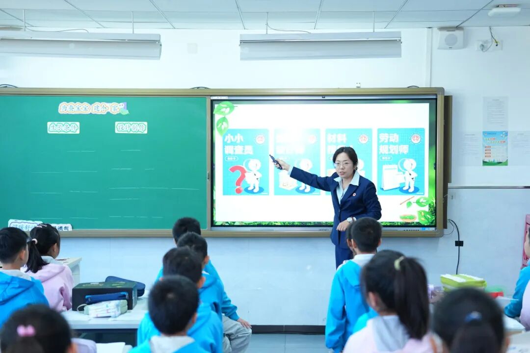 德育副校长于海平以“幸福劳动”课程为例,介绍了学校以“我劳动 我幸福”为核心价值追求,围绕“明劳动之理、培劳动之力、担劳动之责”三个维度构建目标系统,依托“1-4-12”实践路径推进落地。在跨学科学习中,四年级“一米菜园”项目串联三年级养蚕与四年级种植活动,形成劳动与生态循环闭环,让生态理念在劳动中自然涵养。