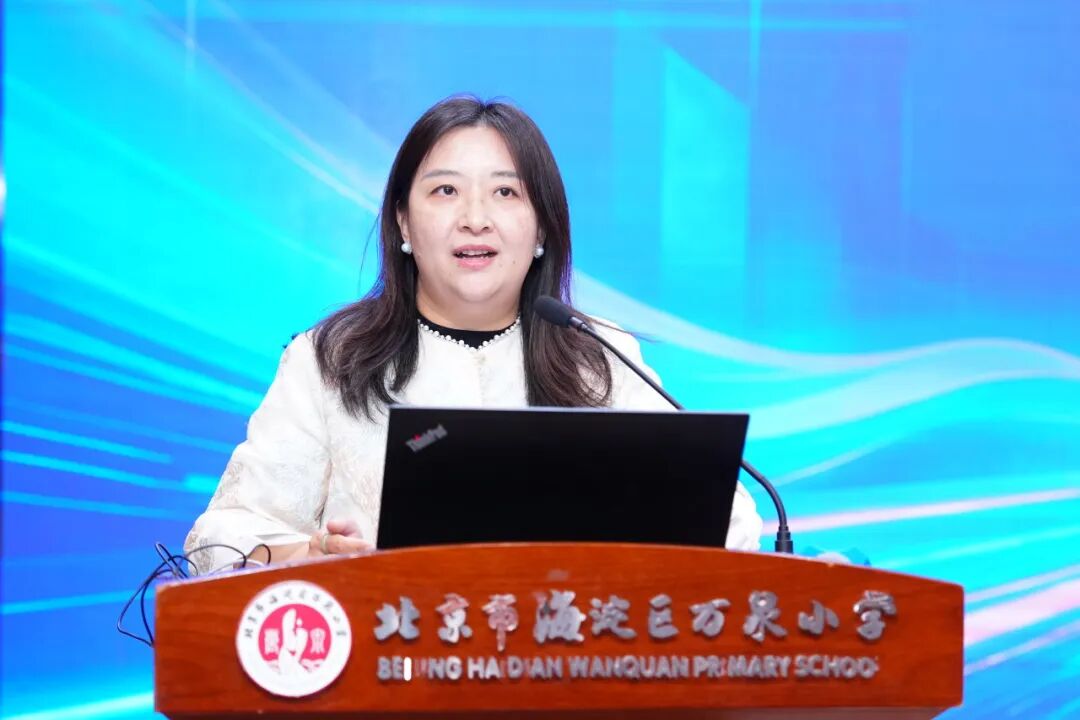 在主题报告环节,海淀区万泉小学教育集团校长金毅以《以“新”拓域,以“质”立人——万泉小学教育集团育人新生态的重构与实践》为题,回顾了学校历经93年积淀的发展历程。她指出,以“新”拓域、以“质”立人,构建起“校园润心、家庭助力、社会联动、数字赋能”四位一体的全环境协同育人格局。在跨学科项目化学习方面,学校确立“问题驱动、跨界融合、实践探究、成果育人”四大理念,形成“问题为引、任务为阶、学科为桥、成果为镜、评价为尺”五阶实施模型,打造了“生态文明·绿色共生”“幸福劳动·实践育人”“思政一体化·培根铸魂”“协同美育·润心启智”四大品牌项目,让核心素养在真实问题解决中落地生根。同时,通过“泉之育”课程体系、“新生态”课堂、“行研培”一体教师发展和“幸福力”评价体系四维协同,筑牢育人支撑系统。目前,教师累计立项或结题市区级以上课题80余项,学校获评北京市教学成果一等奖、课程成果一等奖等多项荣誉。