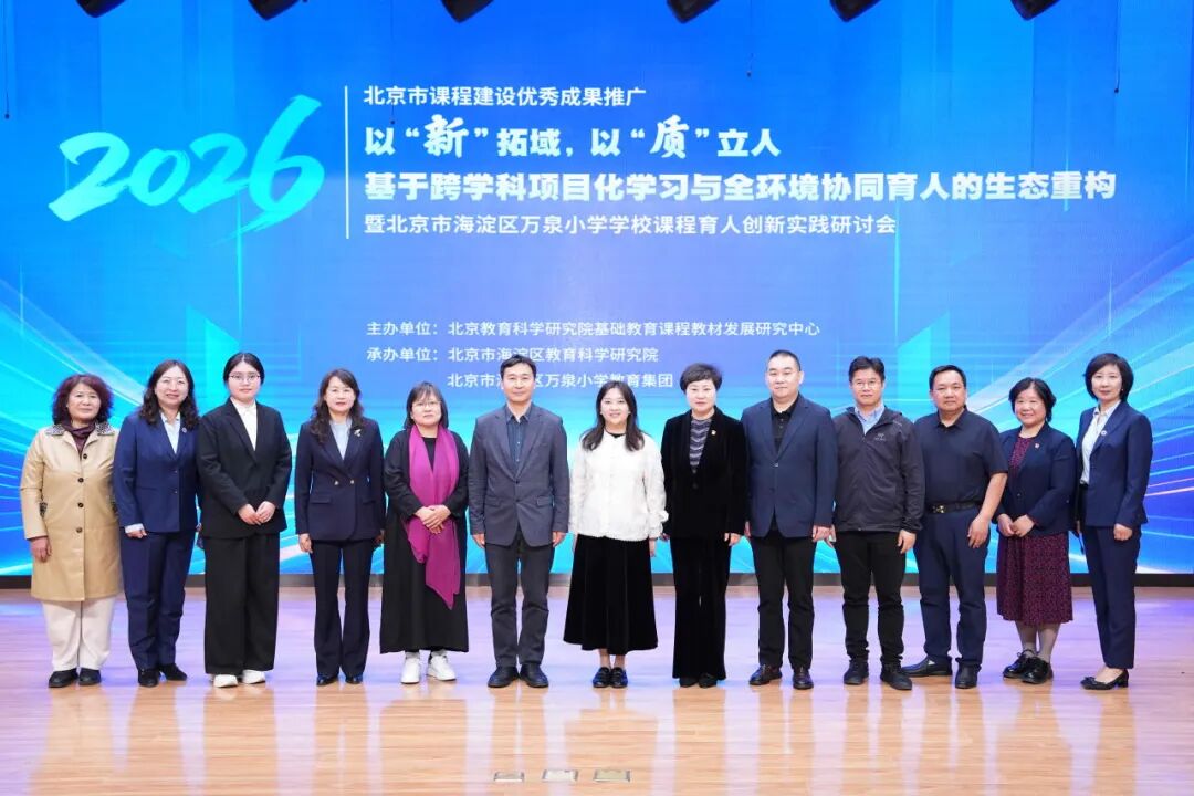 2026年4月27日,由北京教育科学研究院基础教育课程教材发展研究中心主办,北京市海淀区教育科学研究院、北京市海淀区万泉小学教育集团共同承办的“北京市课程建设优秀成果推广现场会”在海淀区万泉小学隆重召开。本次会议以“以‘新’拓域,以‘质’立人——基于跨学科项目化学习与全环境协同育人的生态重构”为主题,来自中国教育学会、北京教科院、海淀区教委、海淀区教科院的专家领导以及北京市各区义务教育课程改革项目校负责人,海淀区各中小学主管课程建设的干部与骨干教师齐聚一堂,共探核心素养导向下育人新生态的构建路径。