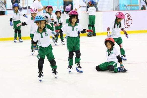翠微小学的同学们带着五颜六色的头盔,身着整齐的校服,脚上穿着滑冰鞋,在冰场上来回穿行,一个个纯真的笑容,一个个娴熟而精彩的动作让记者们赞叹不已。
