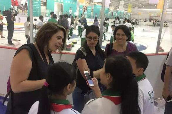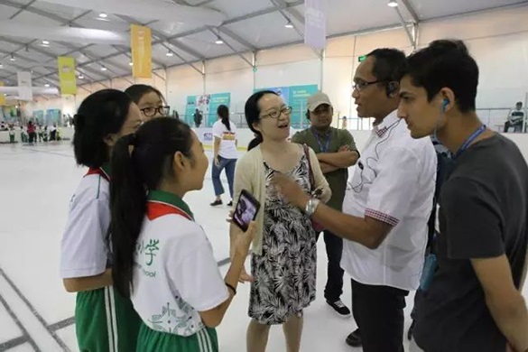 各国来宾和记者来到场地中央的同学们中间,现场观摩了冰场上同学们上课的全过程并换上冰鞋,和学生一起进行了互动、体验,冰场上不时传来不同语言的呼喊声和嬉笑声。